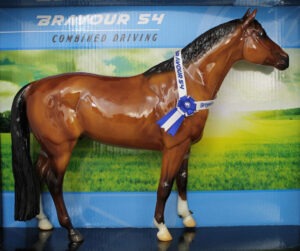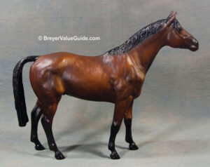 Matte shaded dark bay; dapples; stripe; chin spot; 2 socks; new style long tail introduced on this model; includes "Hickstead" blanket