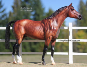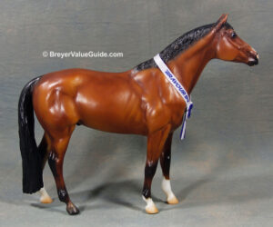 Glossy shaded dark bay; dapples; stripe; 2 socks; new long tail; BreyerFest Prize SR; 1/4