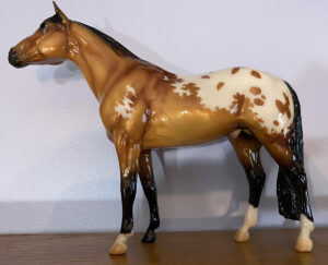 Glossy metallic buckskin appaloosa; mottled nose; blaze; 3 socks; BreyerFest SR; 1/1500 split between glossy and matte finish