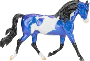 Glossy metallic blue pinto, wide blaze over muzzle, 2 hind socks, BreyerFest SR, 1/200 blue version