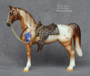 Glossy chestnut appaloosa; extended blanket; splash spots; resist dapples/roaning; brown with gold bridle; collar and saddle; blue ribbon sticker