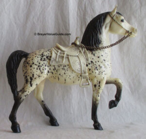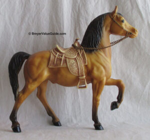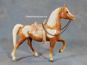 Matte chestnut/palomino pinto; white mane and tail; bald face; 4 stockings; tan saddle; with Brenda Western doll
