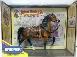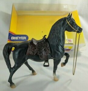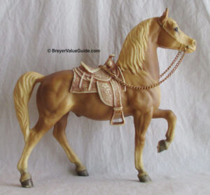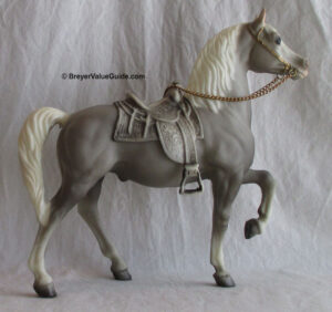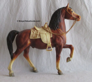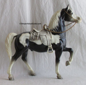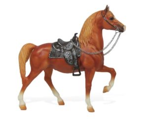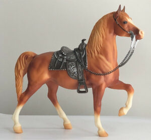 Matte chestnut; stenciled blaze; 4 stockings; brown and silver saddle; silver reins; Warehouse Find