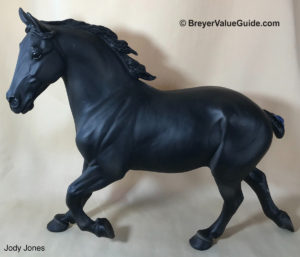 Glossy black; stenciled bald face; 2 hind sock; red tail ribbon; BreyerFest Prize SR; 1/26