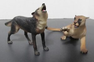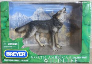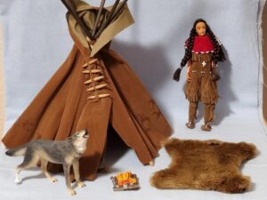 Matte grey, white muzzle. Set with Native American Indian figure in beaded outfit, suede-like tipi, campfire, bearskin blanket.