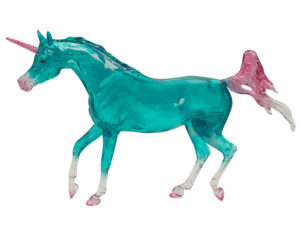 Translucent turquoise with pink muzzle, horn, hooves and tail