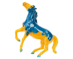 Glossy metallic blue and yellow splash pinto, blue hooves, BreyerFest Event Stablemate SR