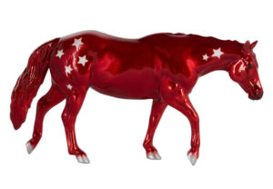 Glossy metallic dapple red with a metallic blue mane, tail, and legs, BreyerFest Event Stablemate SR