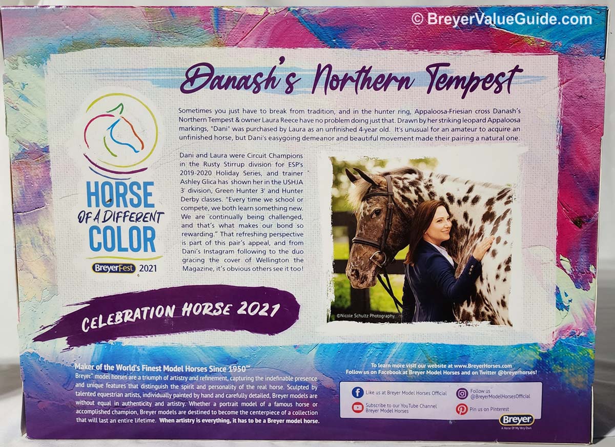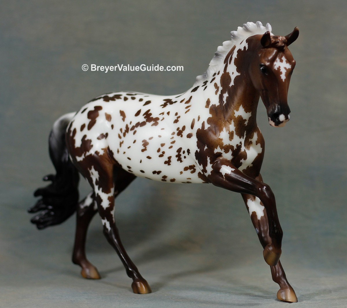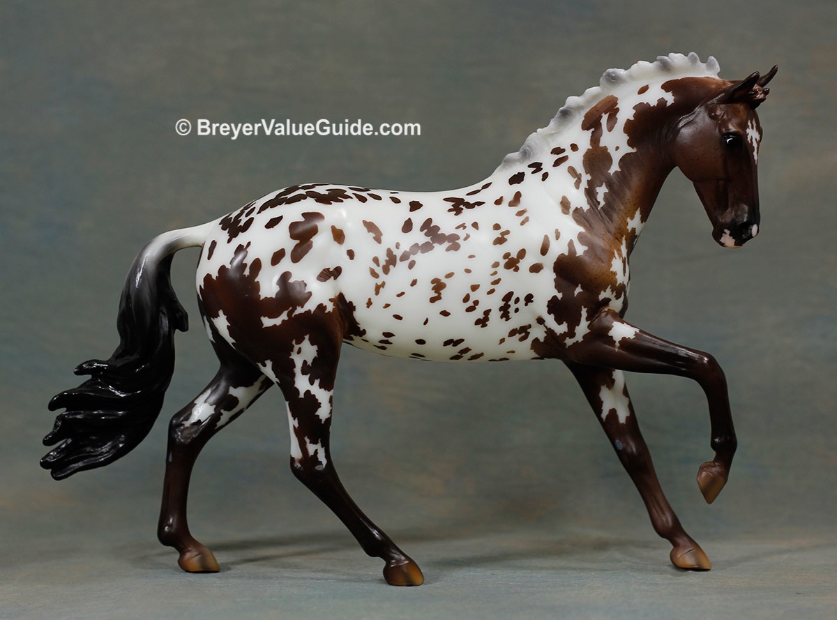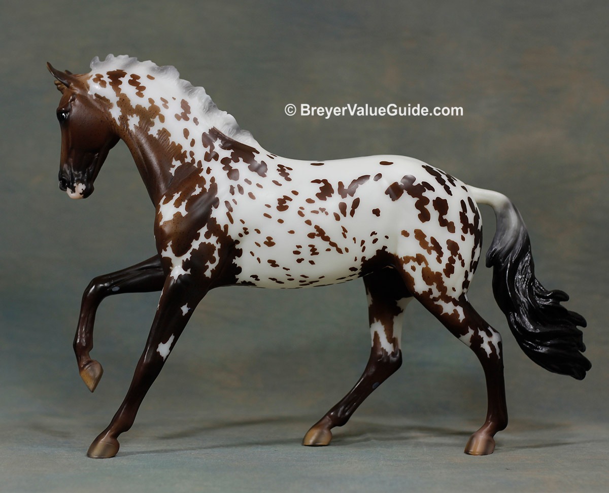 Matte dark chestnut leopard appaloosa, large star, dark legs and tail, white and grey shaded mane, striped hooves, BreyerFest Celebration SR