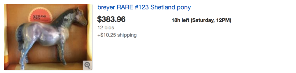 This first listing is an excellent example of how vintage boxes and packaging can really increase the value of the model inside. Alone, even in mint condition, the #123 Shetland Pony may only bring $10-$20, but find one inside a presentation box, and the value skyrockets. How high? We will find out at the end of this auction. Check it out: