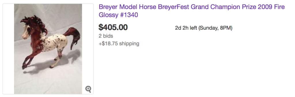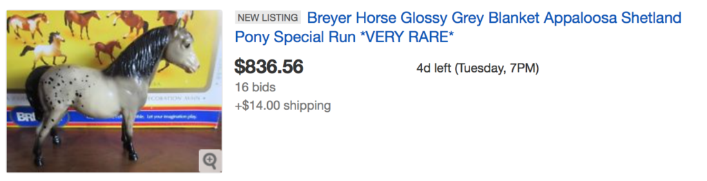 For the last model, we’re going vintage again, and back to the Shetland Pony. This glossy appaloosa Shetland was not a numbered run, and at best guess is a very small run or test run from the 1960s. As you can see from the eBay auction already, it is a grail model for many vintage collectors and is rarely ever seen for sale. Even in you are not in the market to bid on this rare find, it will be neat to see how valuable it is to collectors who need it in their collection! Check it out: