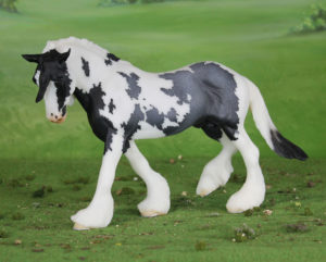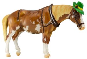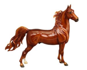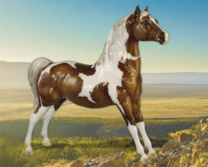 Matte shaded chestnut; dapples; wide blaze; 4 socks; pinto marking on belly; striped hooves; 3rd in America the Beautiful Series; Web SR; 1/350