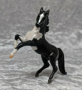 Semi-gloss black and pearlescent white pinto; blaze; white patch on chest; 2 front socks; BreyerFest SR; 1/1500