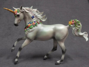 Porcelain; iridescent shaded grey with dapples; flower decorations; gold horn; "BreyerFest 2011" stamped on belly; BreyerFest SR; 1/400