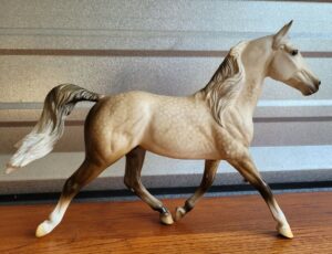 Glossy light grey; fleabites; snip; striped hooves; clear base; BreyerFest Prize SR; 1/30