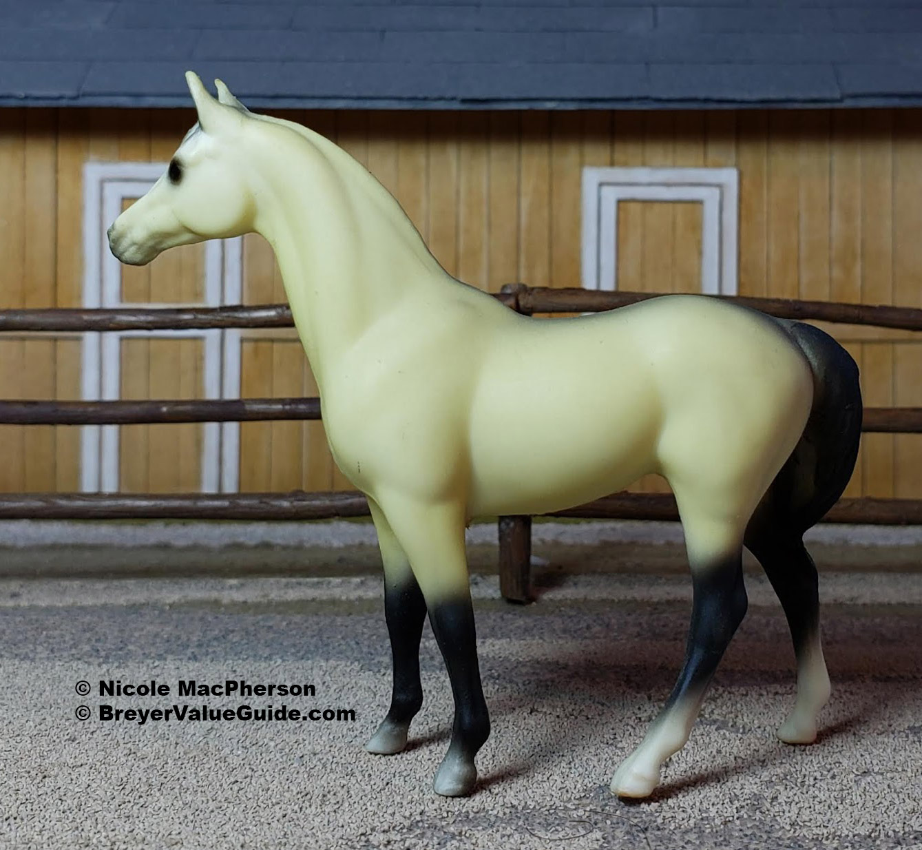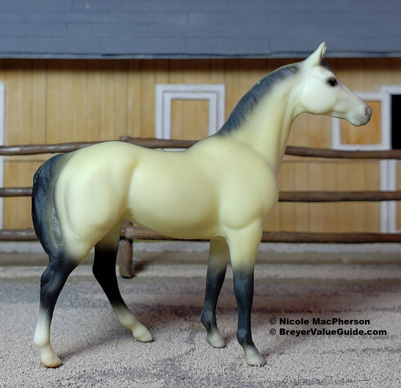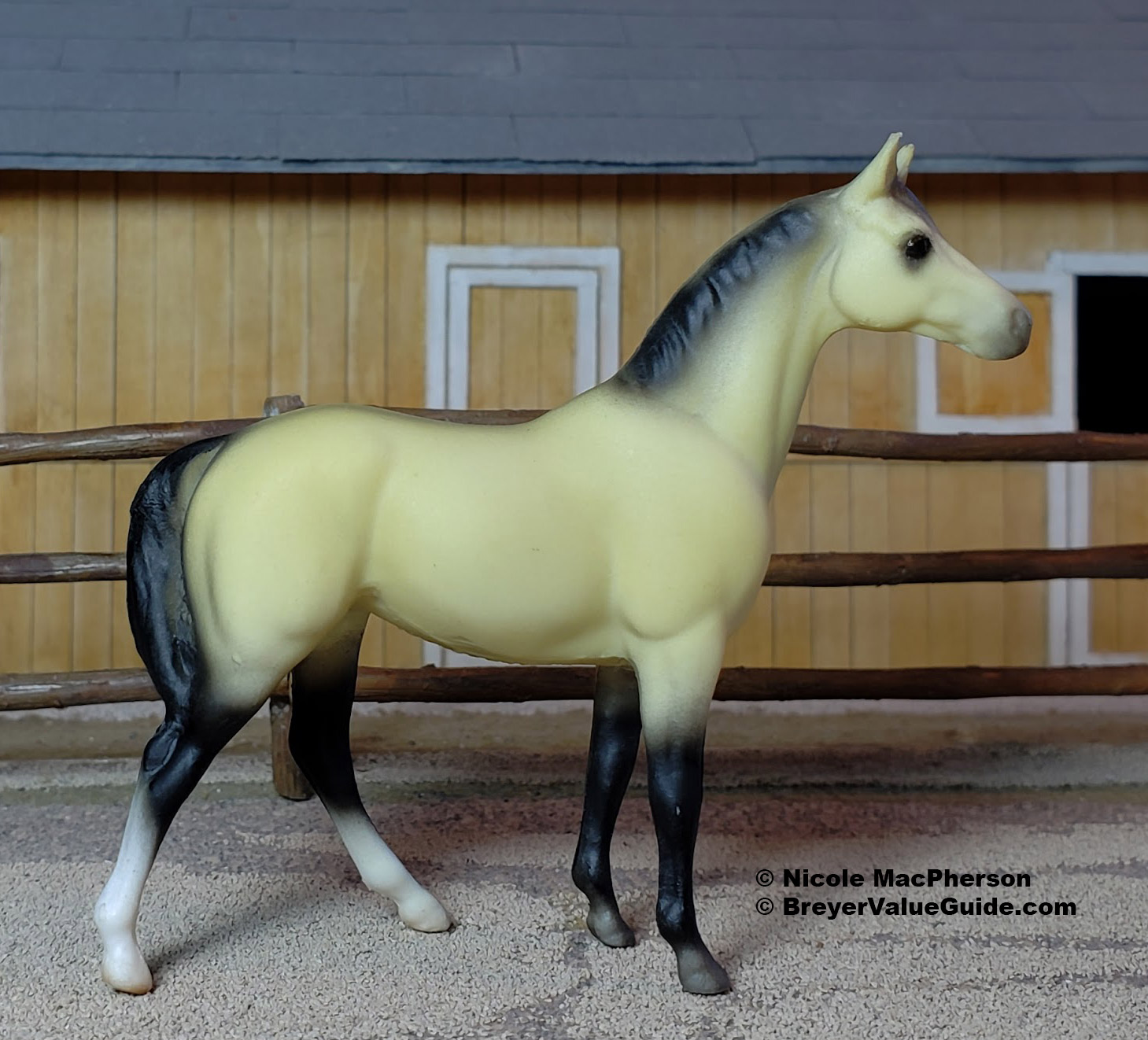 Matte light buckskin/dun; dorsal shading; black points; hind socks; JCPenney SR