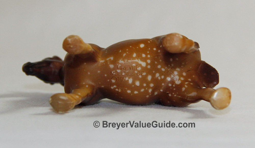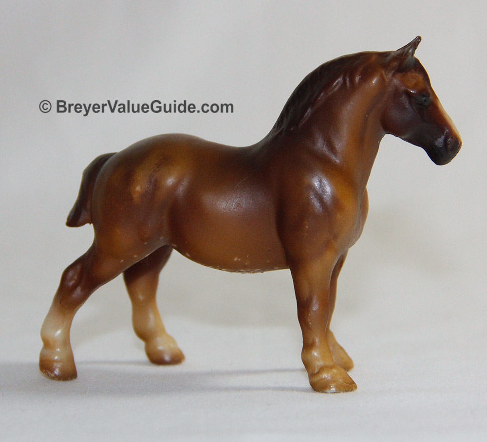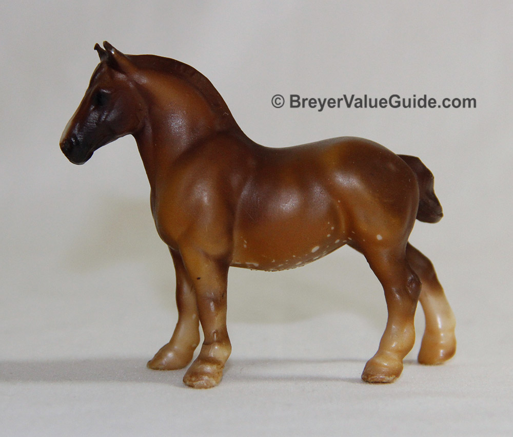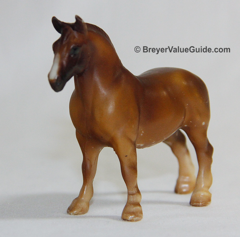 Matte shaded chestnut/brown; blaze; darker head, mane and tail; various socks/lighter legs; resist dapples/roaning on belly; JCPenney SR