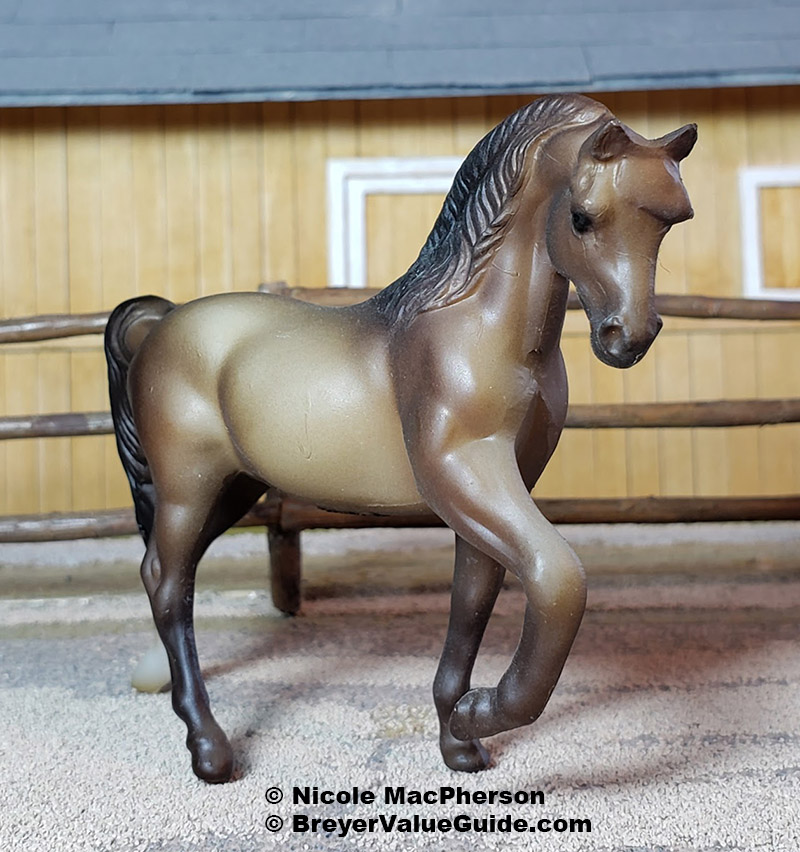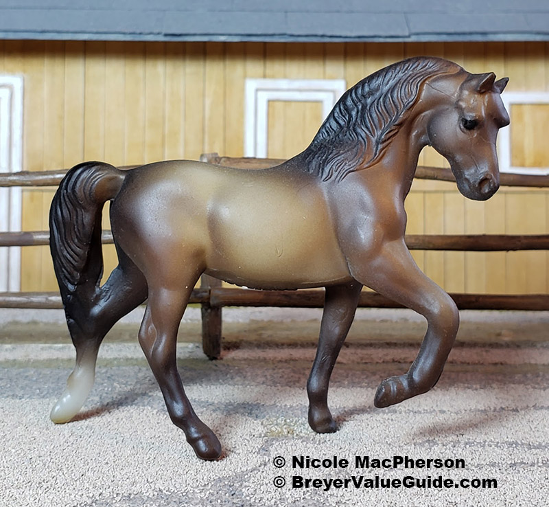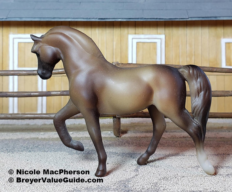 Matte dark chestnut; darker mane and tail; 1 hind sock; JCPenney SR