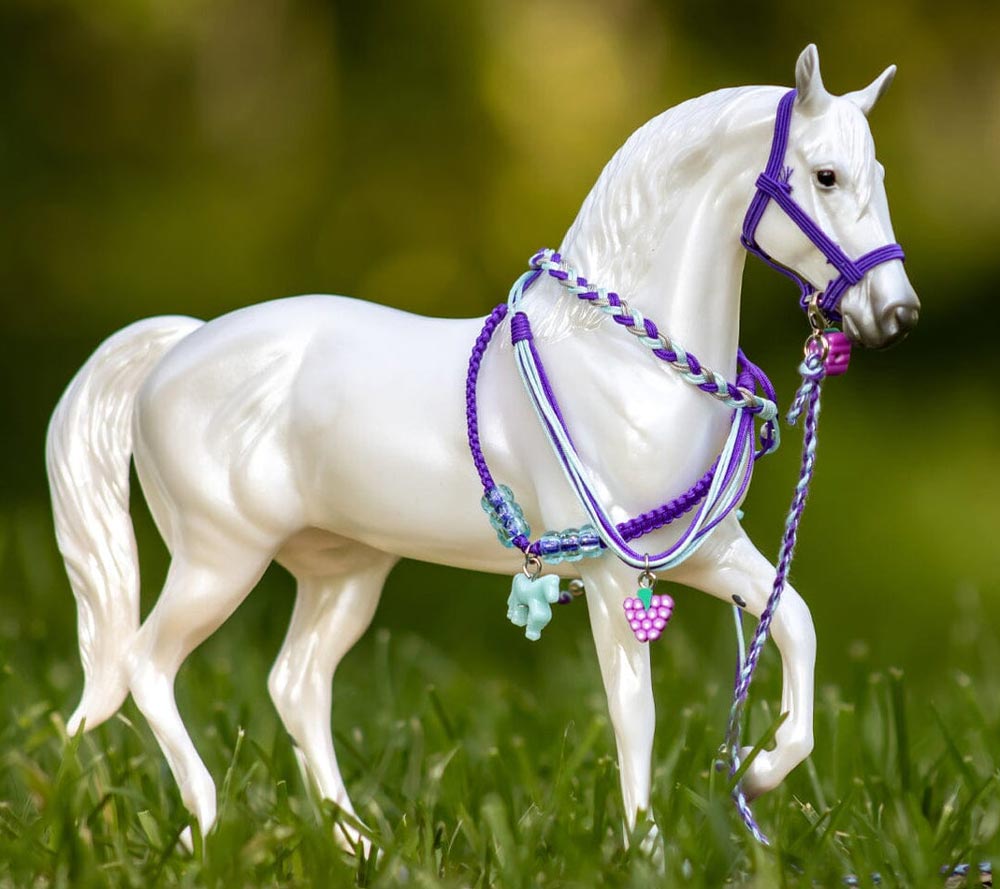 Pearly white, grey muzzle and hooves, with purple halter and bracelets
