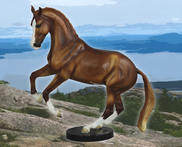 Matte shaded chestnut; dapples; wide blaze; 4 socks; pinto marking on belly; striped hooves; 3rd in America the Beautiful Series; Web SR; 1/350