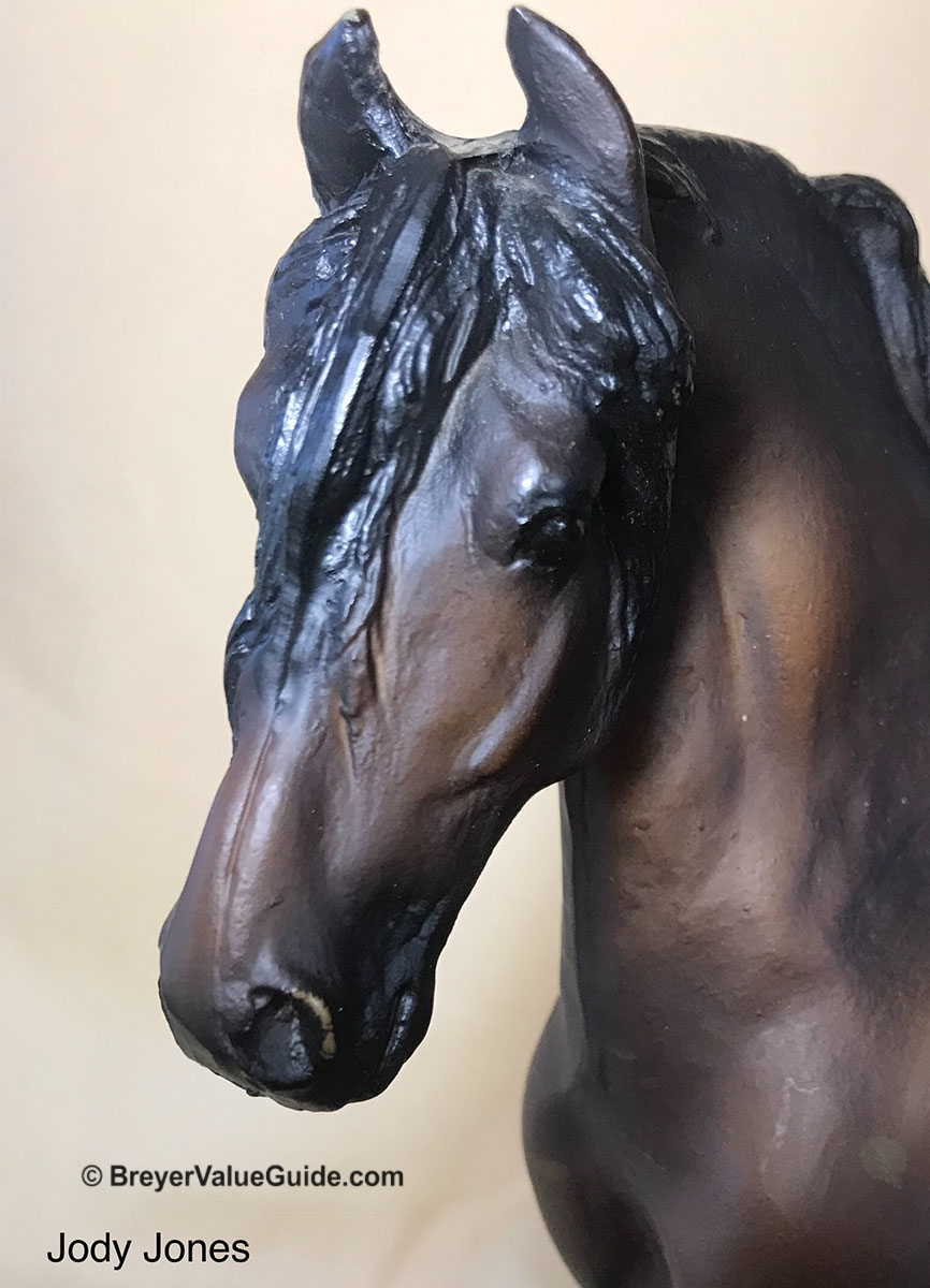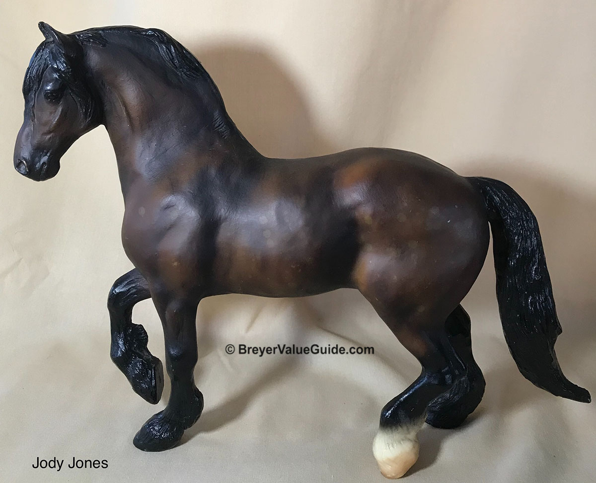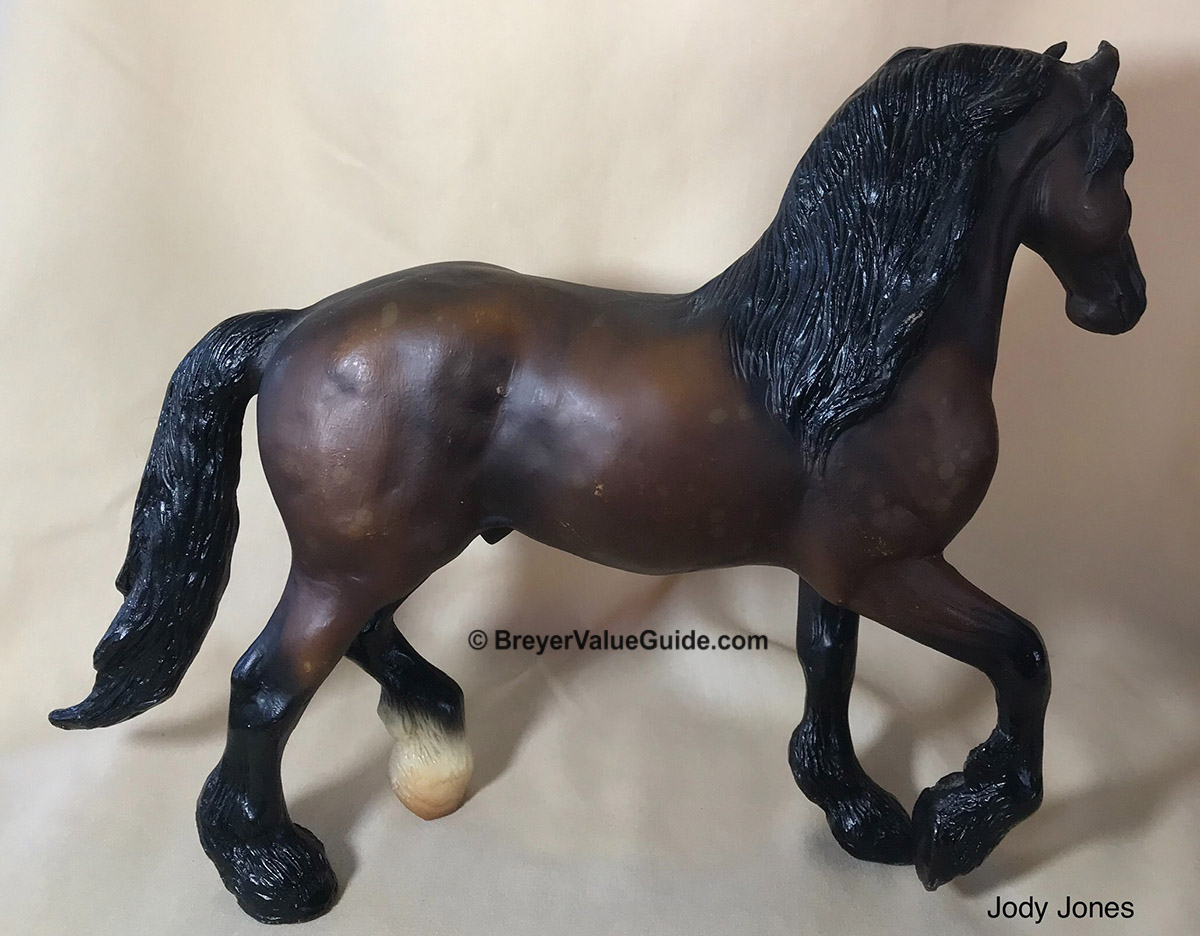 Matte dark bay; polka-dot-like resist dapples; solid face; 1 hind sock