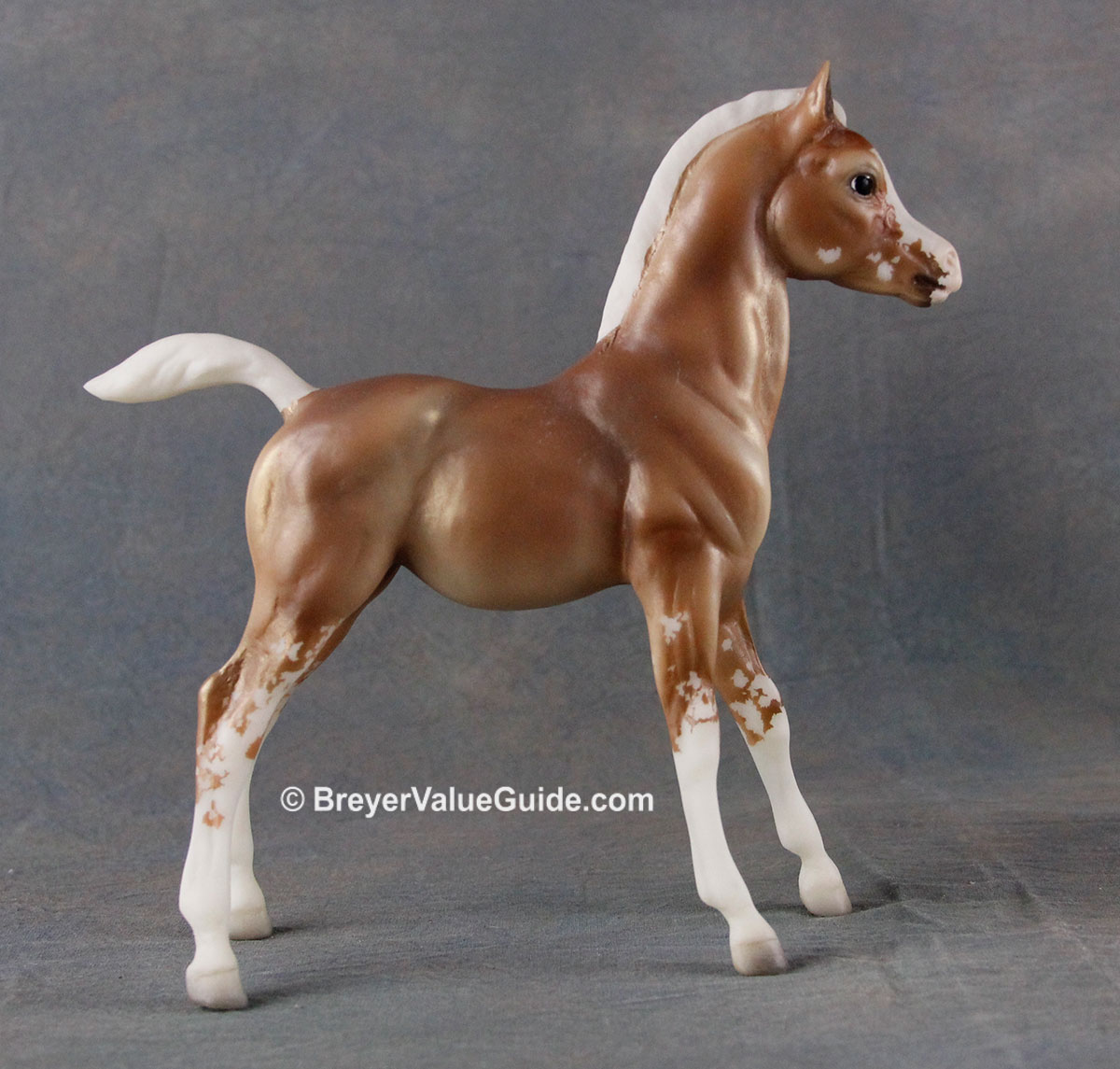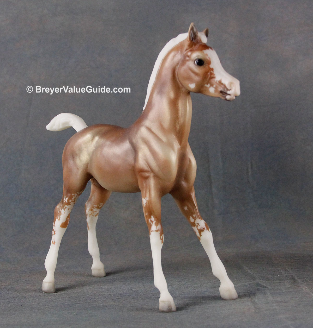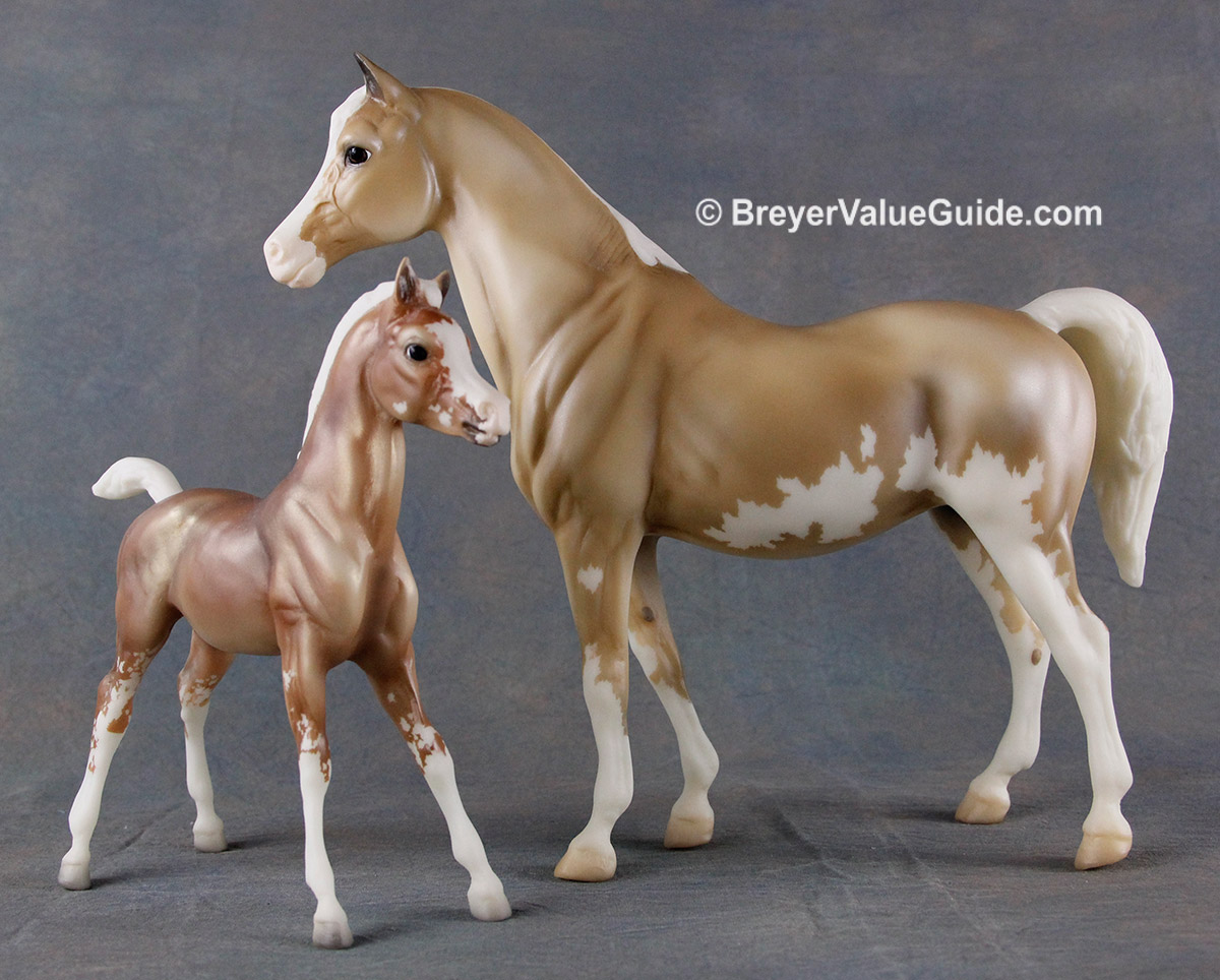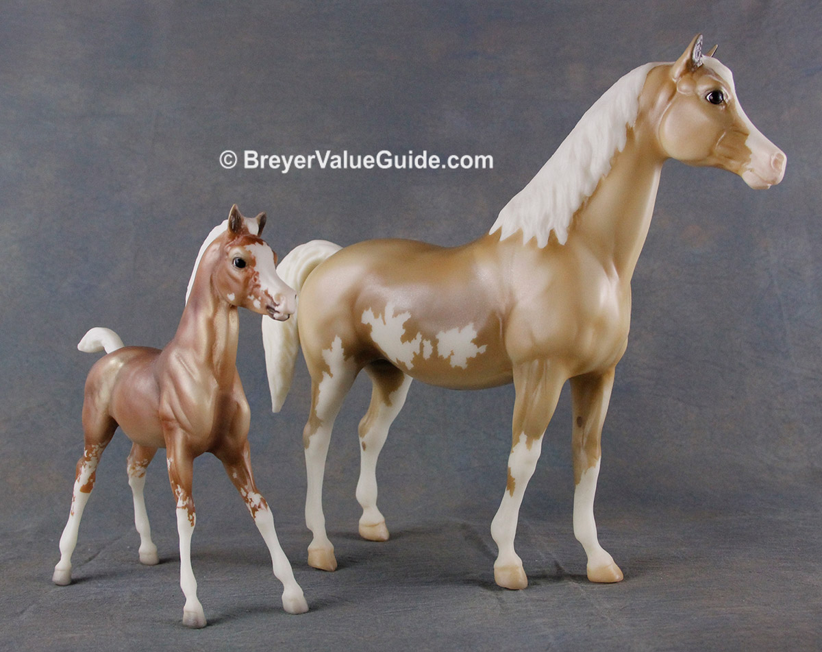 Mare: Matte palomino sabino pinto; 4 high whites; wide blaze; detailed eyes Foal: Matte dark palomino sabino pinto; 4 high whites; wide blaze; detailed eyes