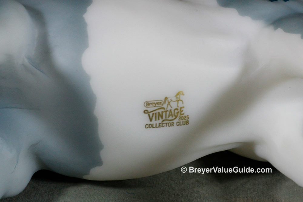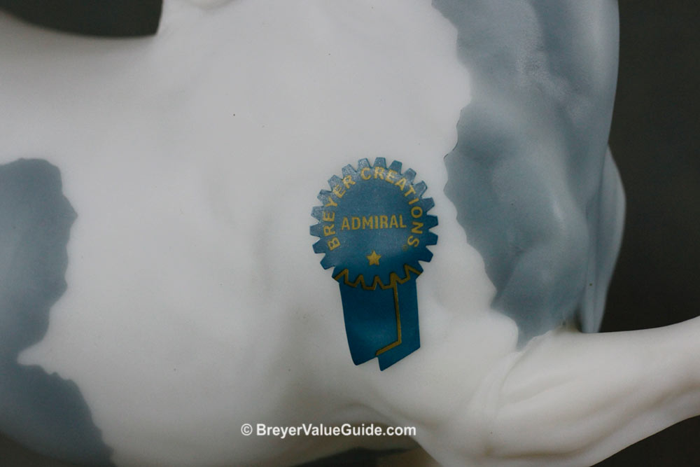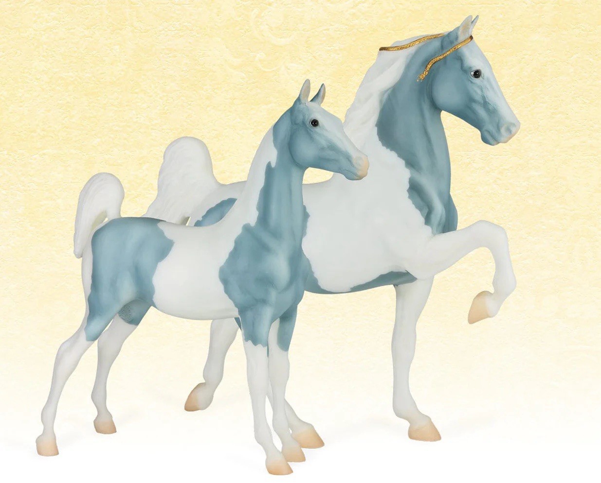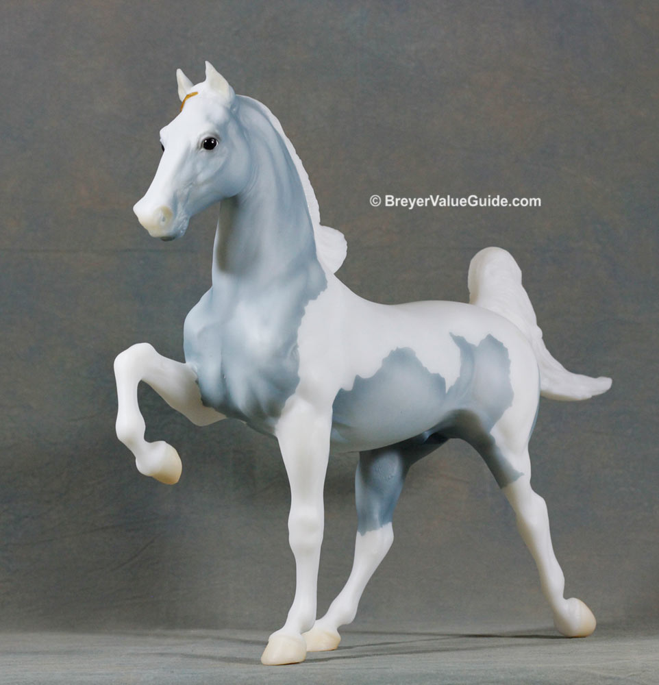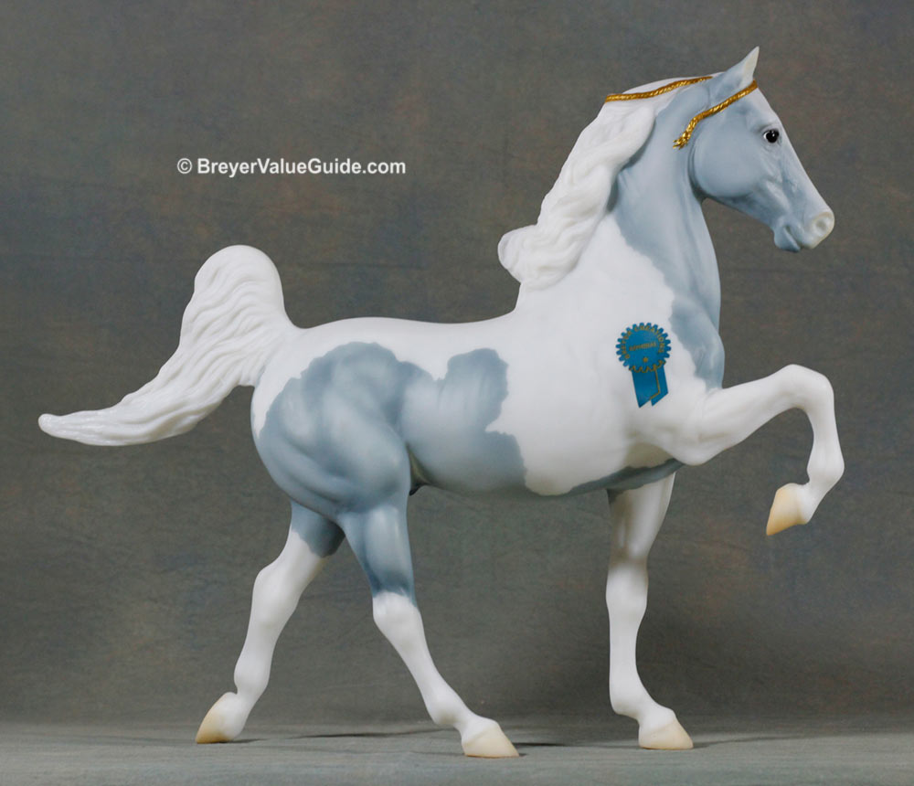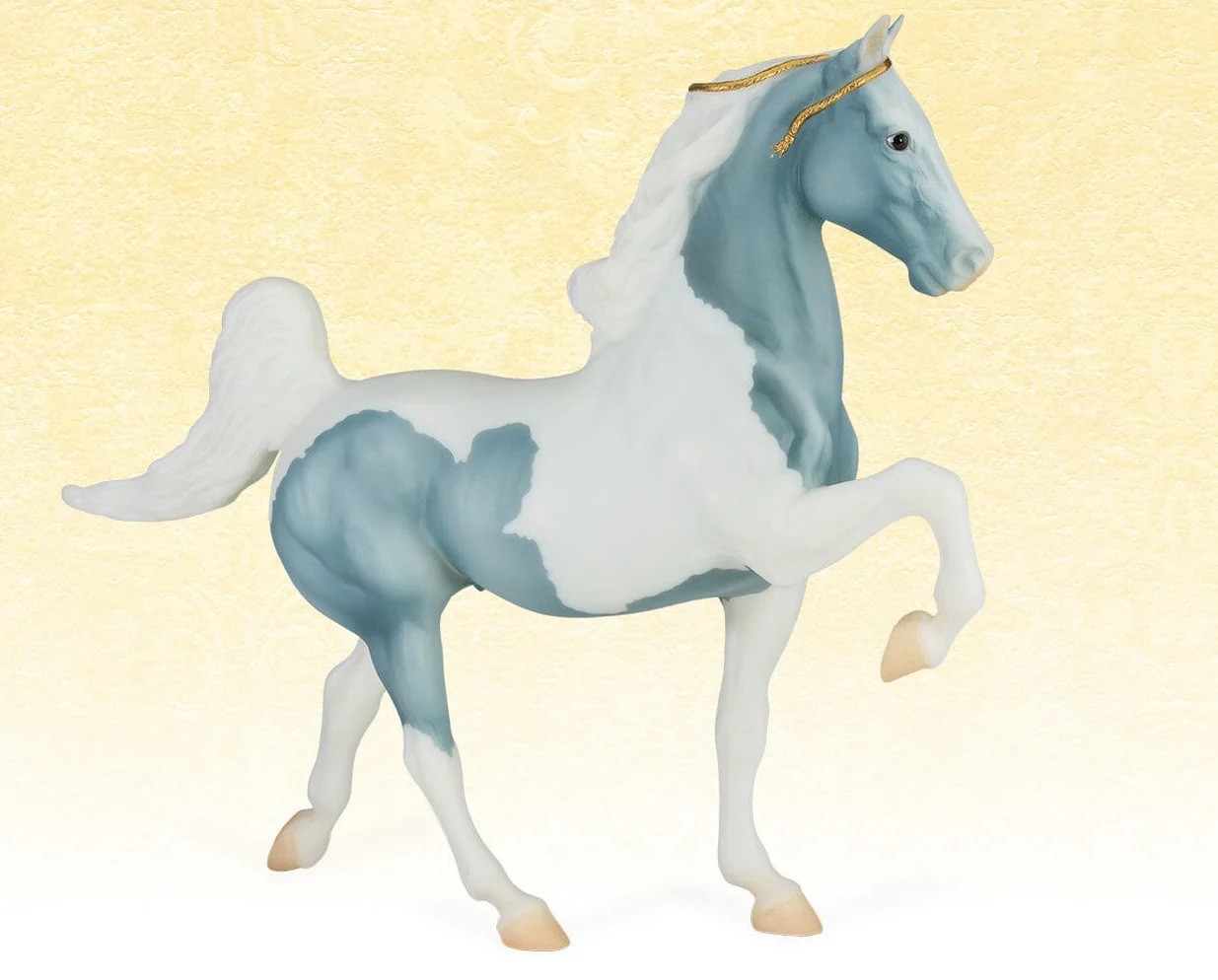 Five Gaiter – Matte Wedgwood blue pinto, bald face, gold ribbons, natural hooves, blue ribbon sticker