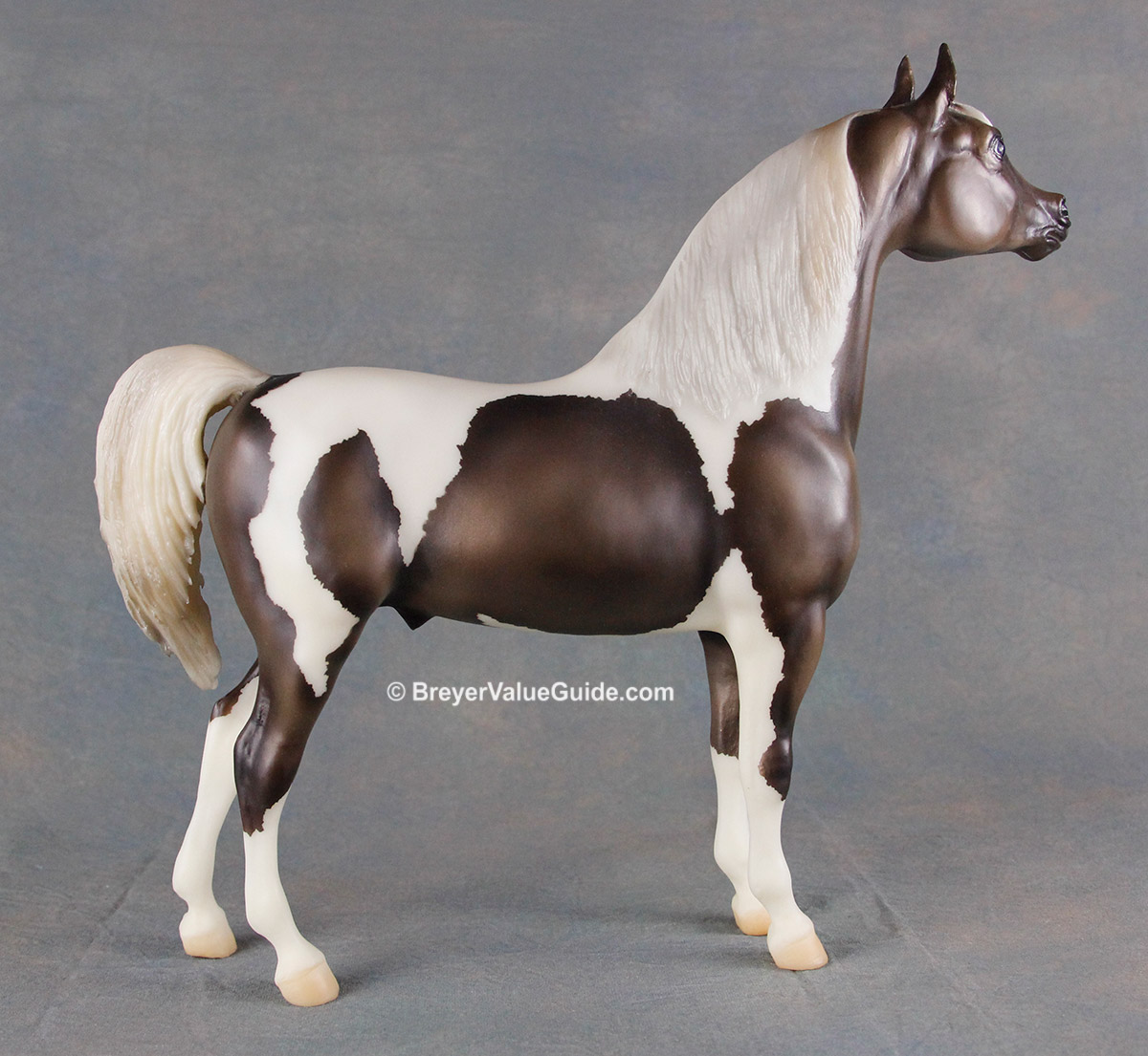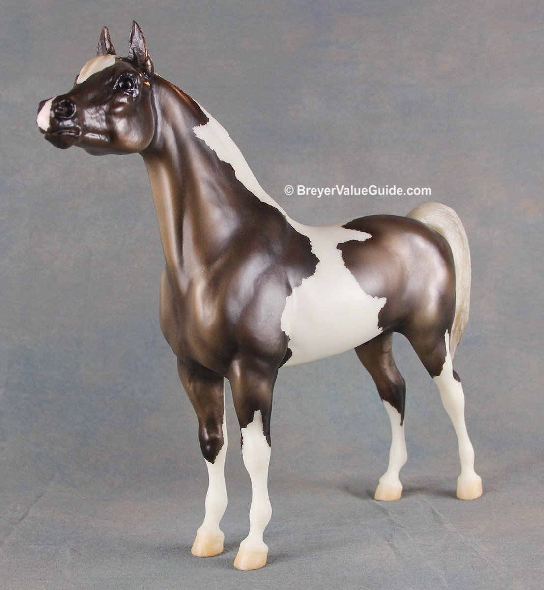 Semigloss metallic chestnut pinto; light flaxen mane and tail; large snip; 4 stockings; BreyerFest Volunteer SR; 1/100