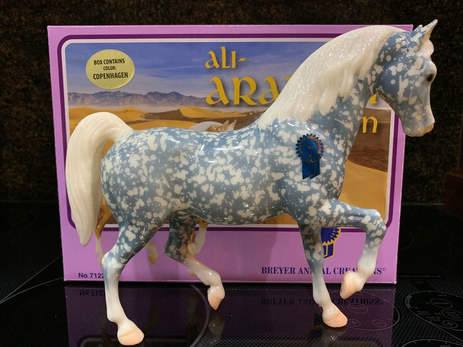 Glossy copenhagen blue; white mane and tail; bald face; 4 socks; blue ribbon sticker, Vintage Club SR; 1/125