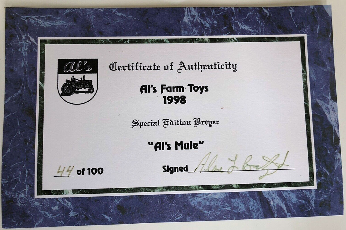 Matte dark seal bay with pack harness; SR released through Al’s Farm Toys; includes COA; 1/100 Same as That Darn Mule Value based on 2021 auction, new in box with COA.