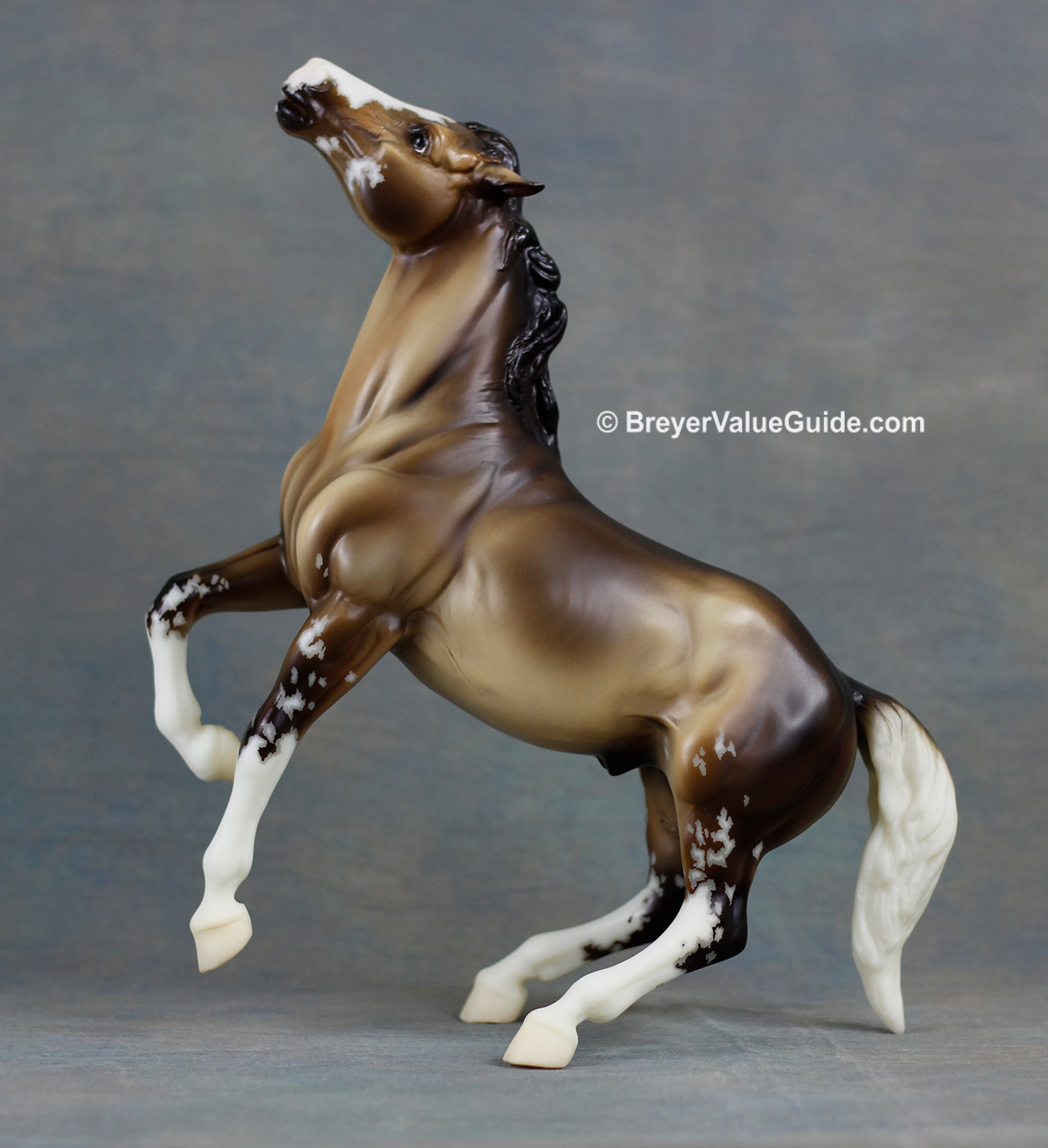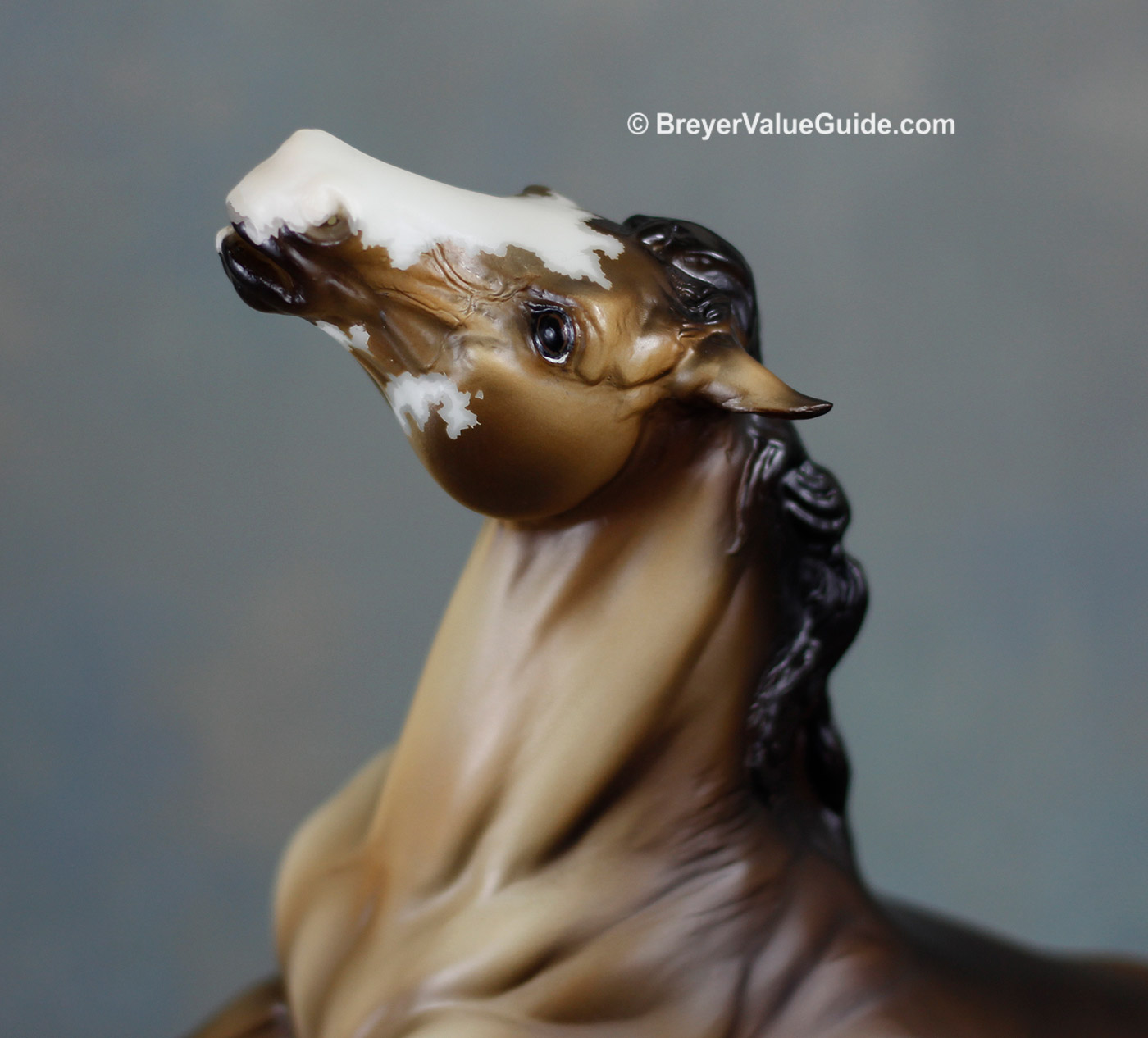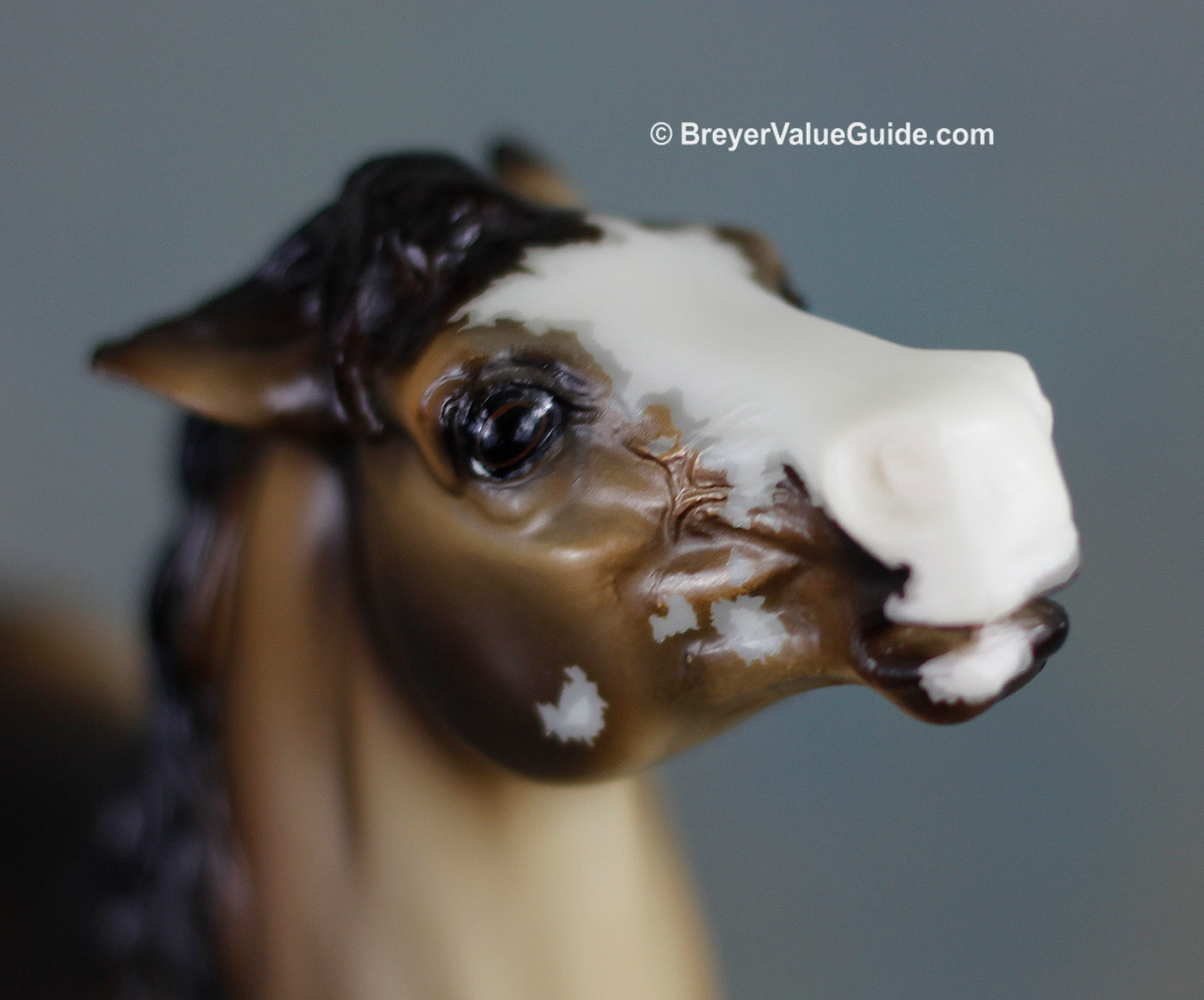 Semigloss sooty palomino; stenciled bald face; detailed eyes; sabino markings; dark mane; white tail; 4 stockings; mapped markings; numbered on hoof; Connoisseur SR; 1/350