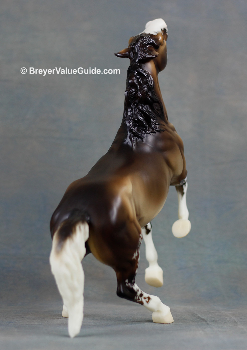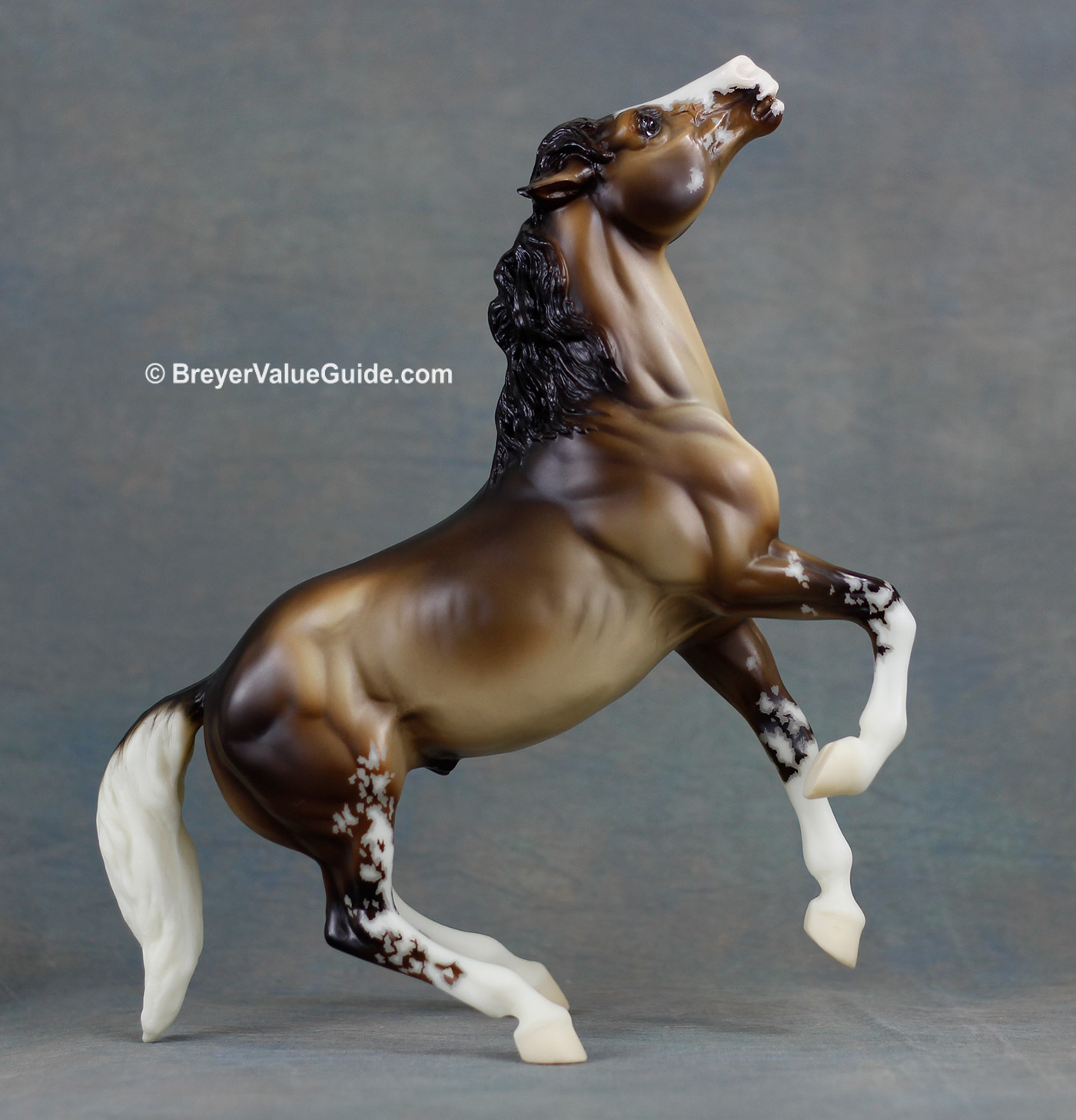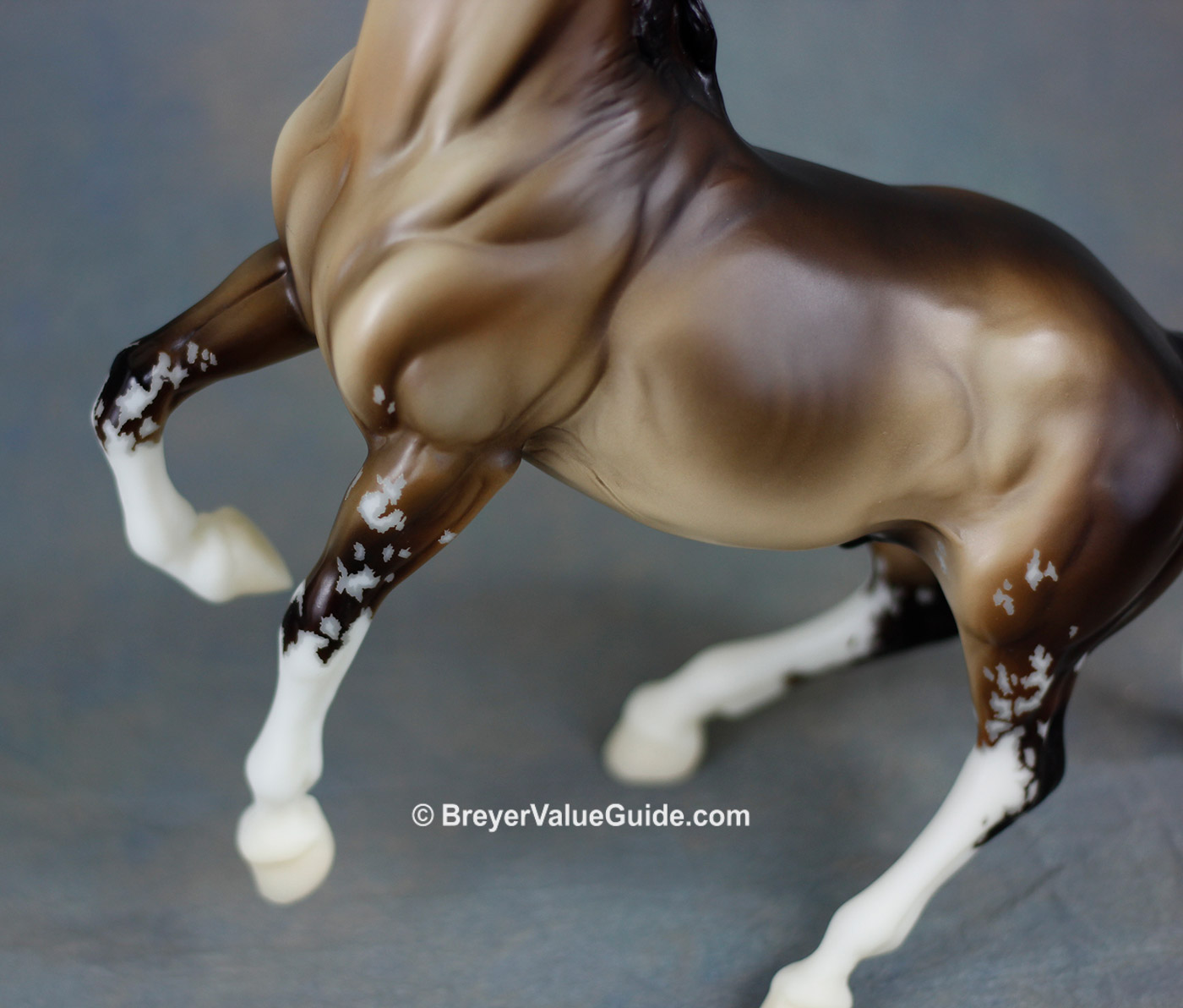 Semigloss sooty palomino; stenciled bald face; detailed eyes; sabino markings; dark mane; white tail; 4 stockings; mapped markings; numbered on hoof; Connoisseur SR; 1/350