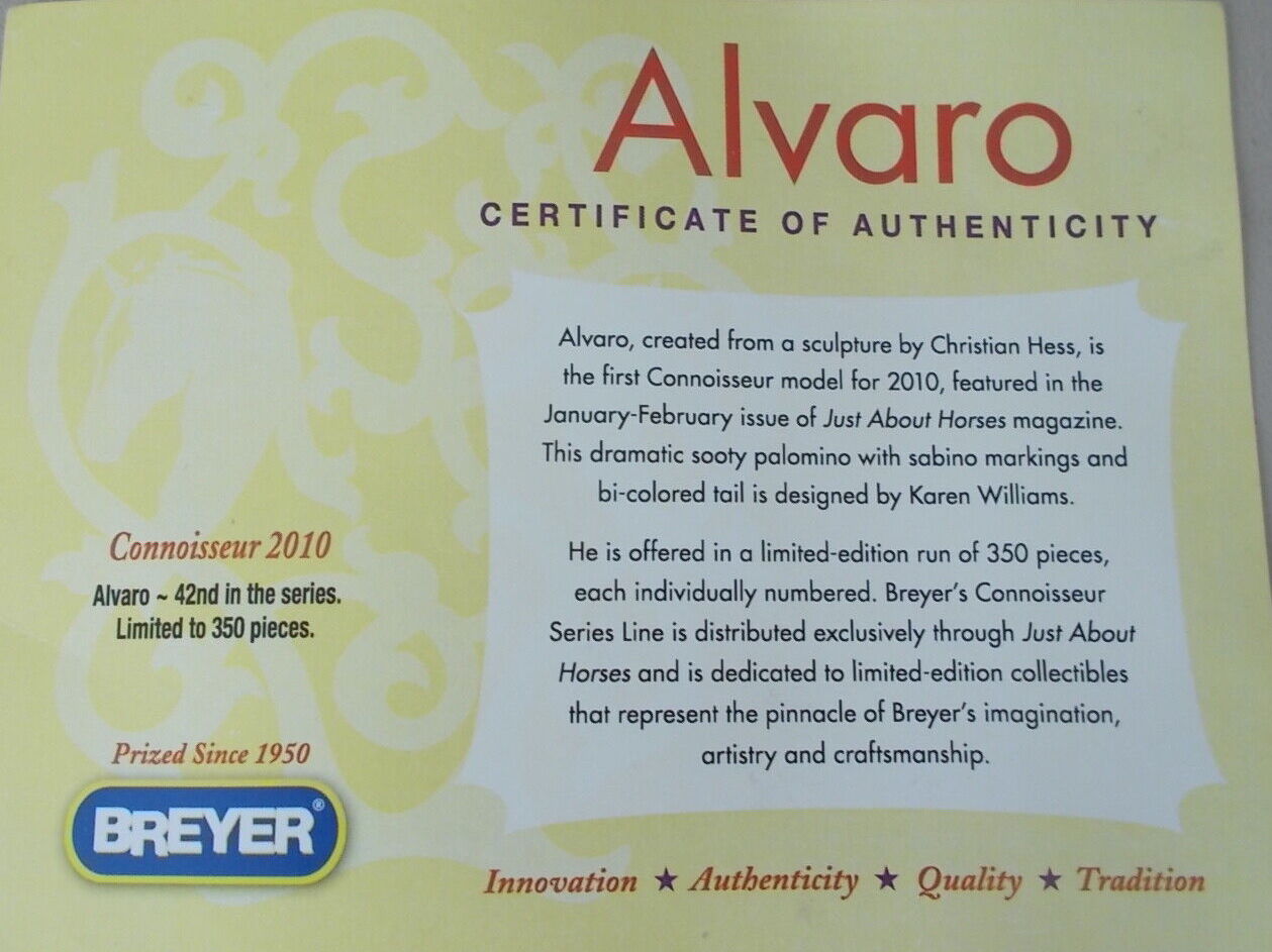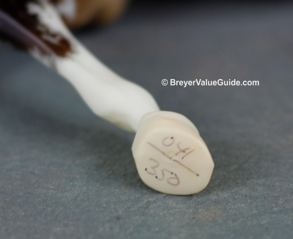 Semigloss sooty palomino; stenciled bald face; detailed eyes; sabino markings; dark mane; white tail; 4 stockings; mapped markings; numbered on hoof; Connoisseur SR; 1/350