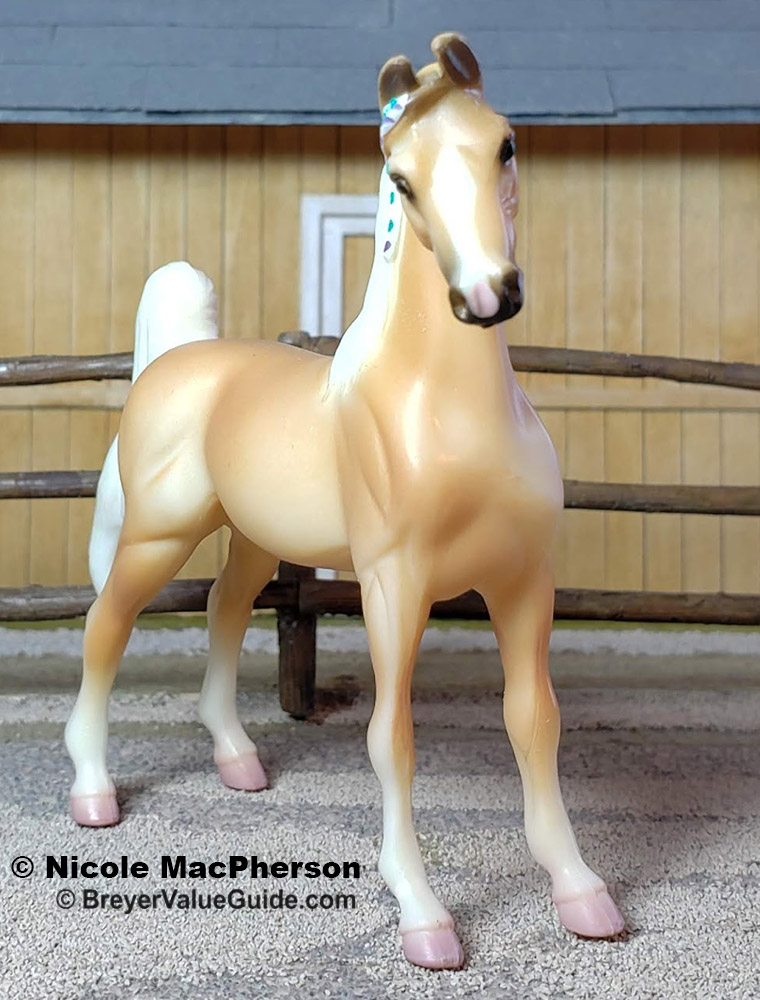 Matte palomino, blaze with pink snip, 4 socks, green and blue on white ribbons