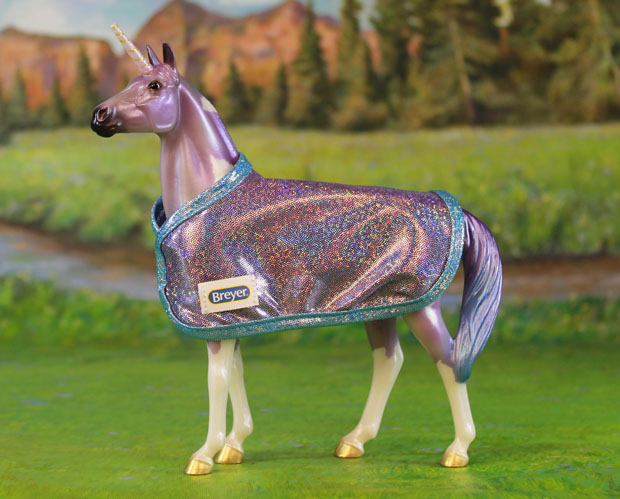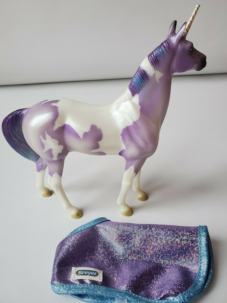 Pearlescent lavender pinto; unicorn horn; white legs; gold hooves; Web SR; includes blanket