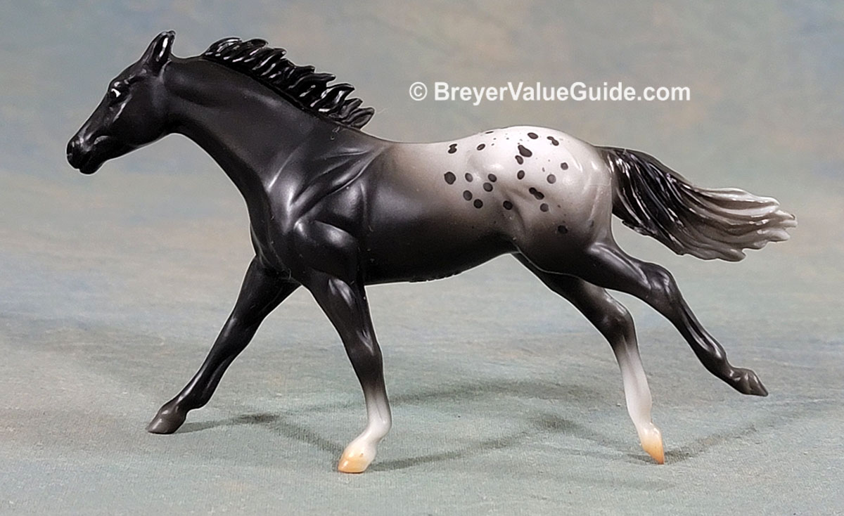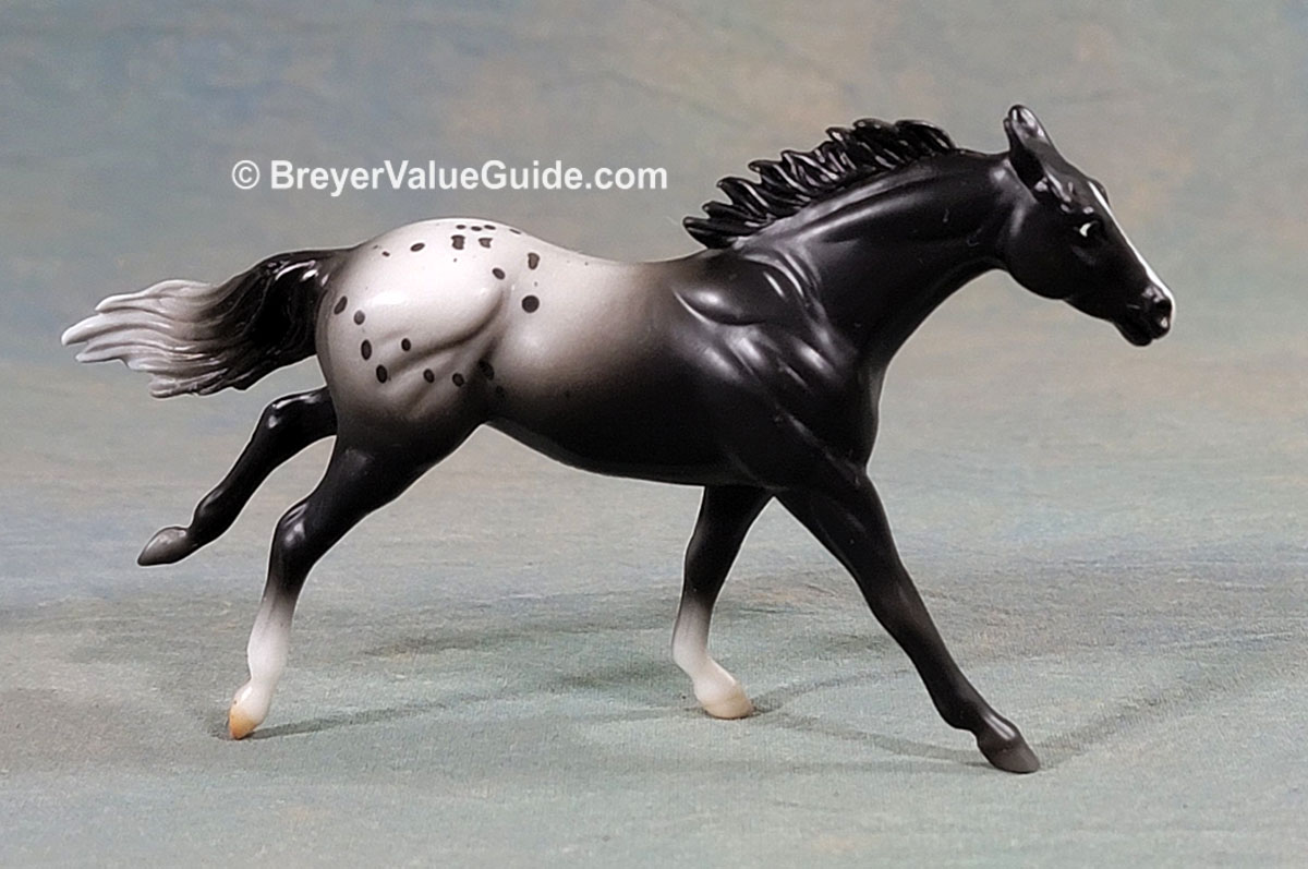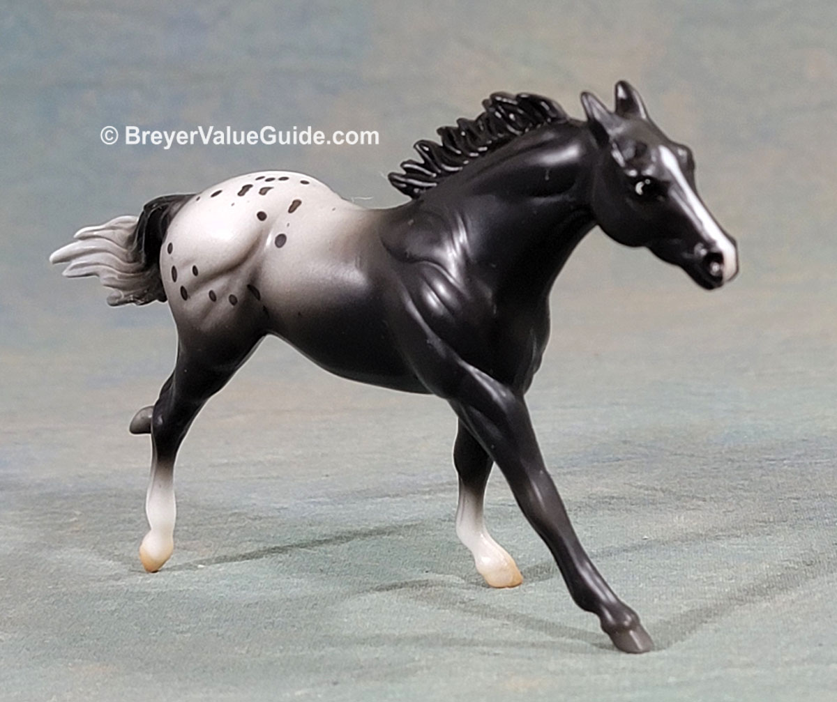 Matte black blanket appaloosa; black splash spots; blaze; bi-color tail; 2 socks; Walmart release Same as #97244.