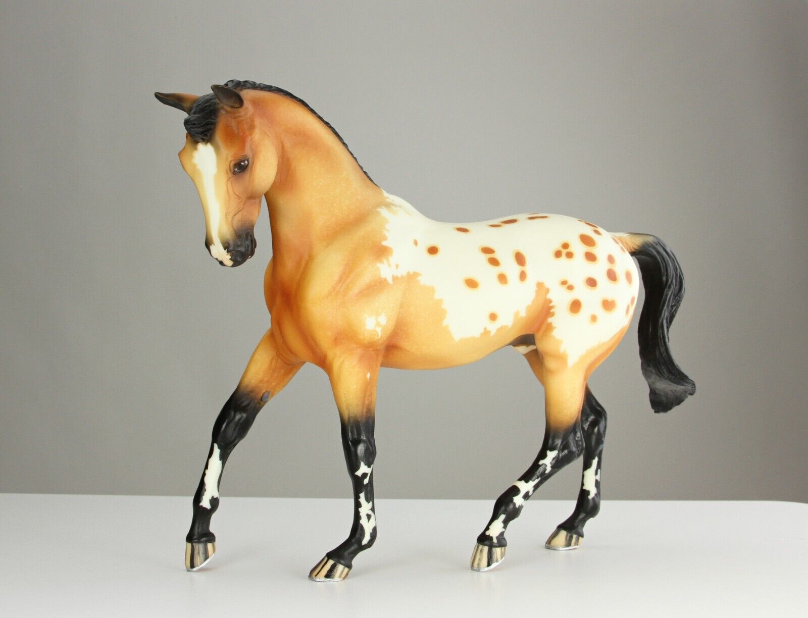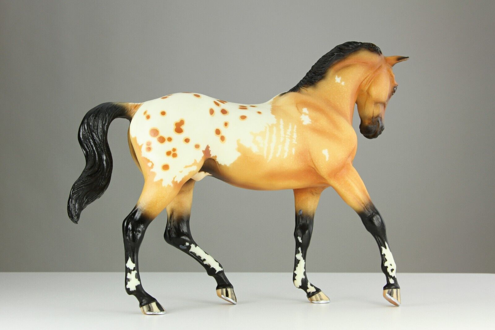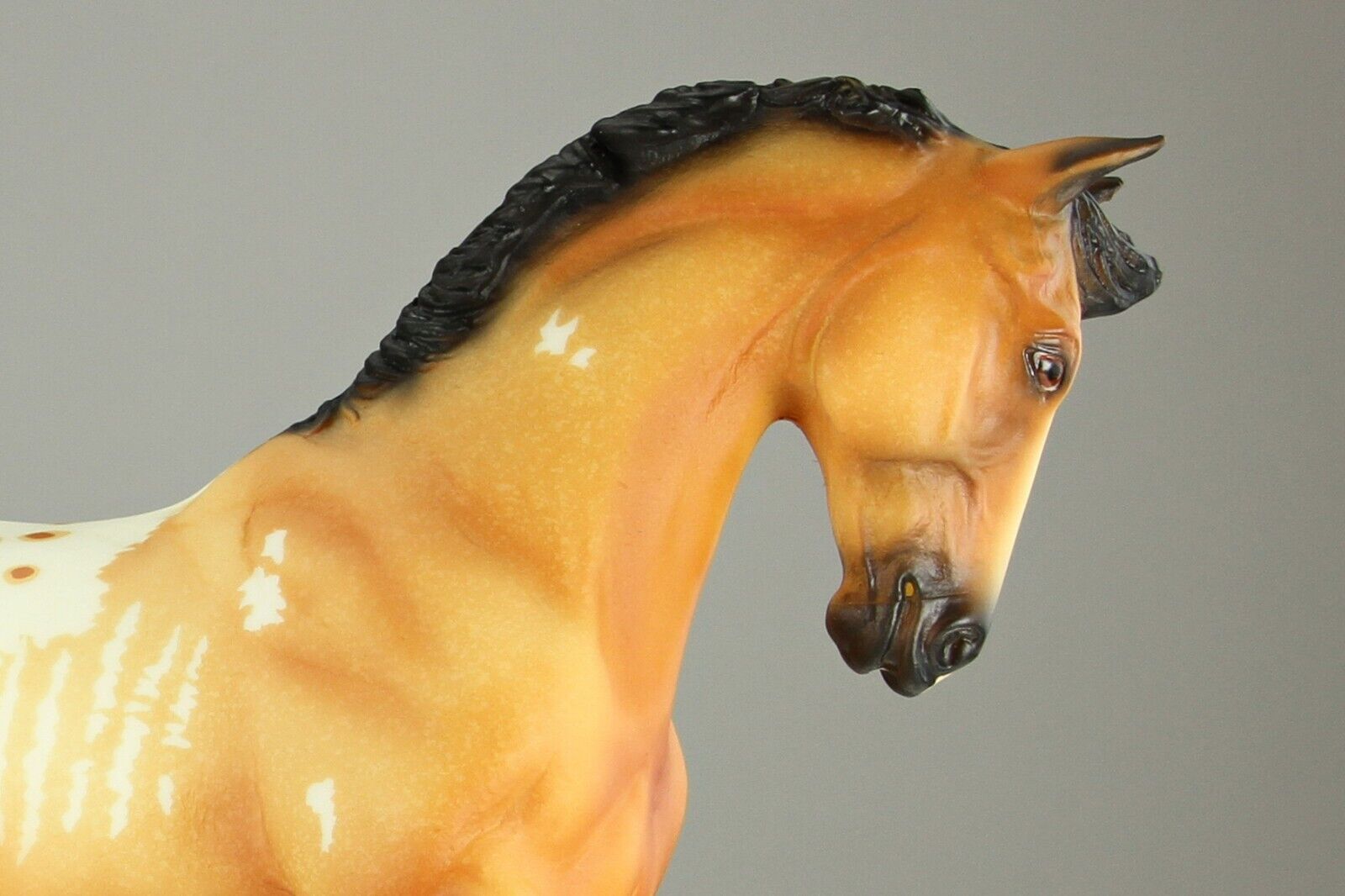 Matte buckskin appaloosa; stripe-snip; spotting on black legs; striped hooves; numbered; JAH Connoisseur SR; 1/350