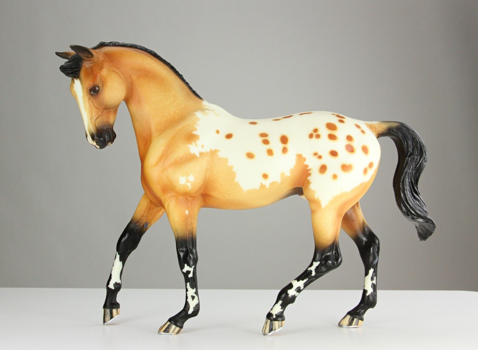 Matte buckskin appaloosa; stripe-snip; spotting on black legs; striped hooves; numbered; JAH Connoisseur SR; 1/350