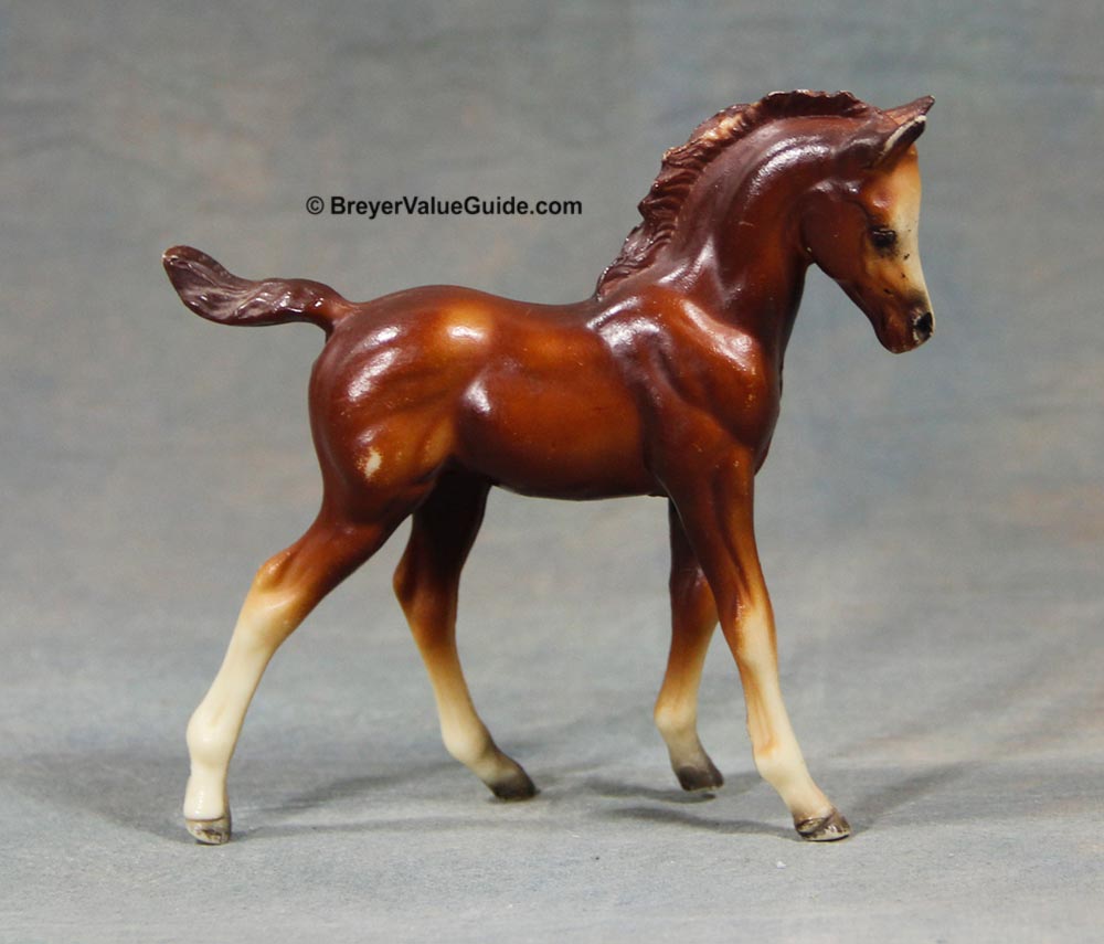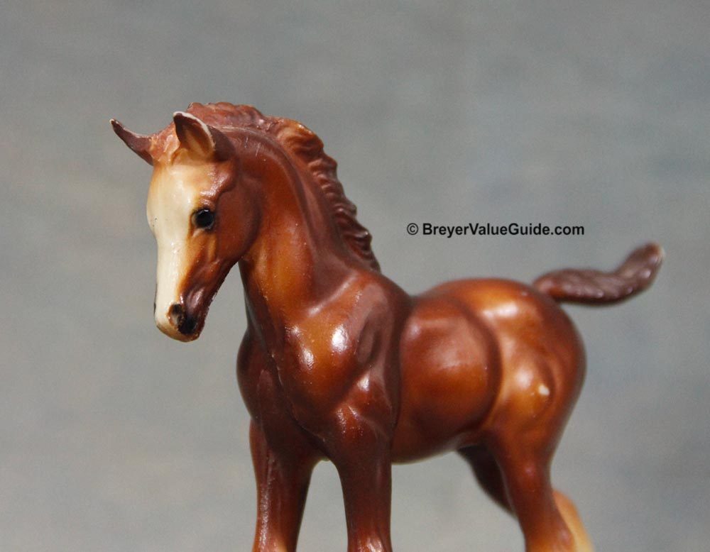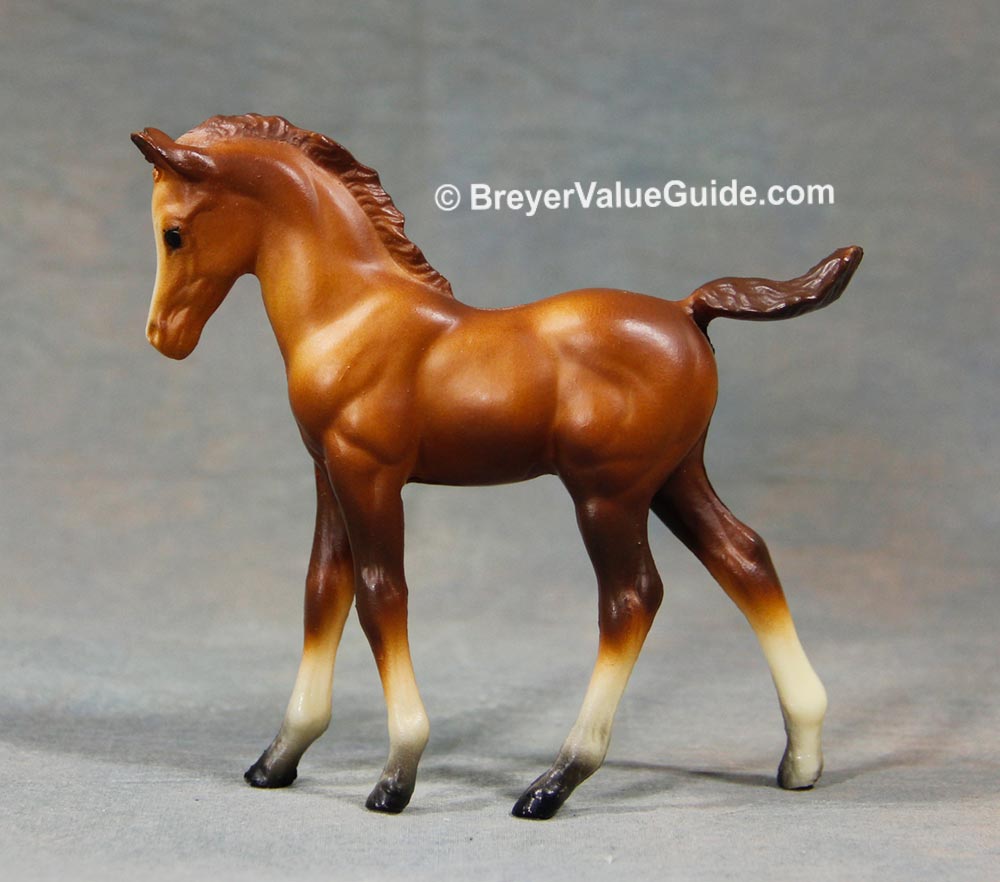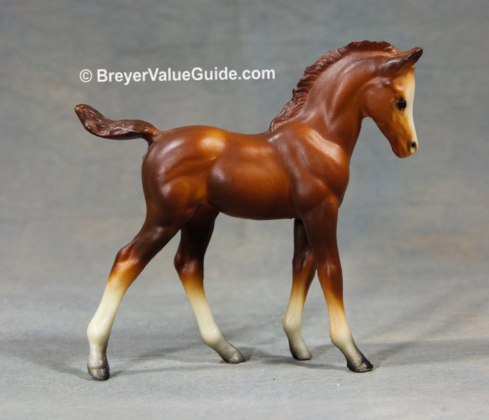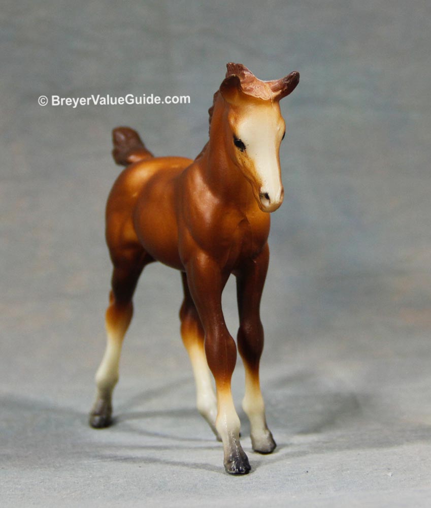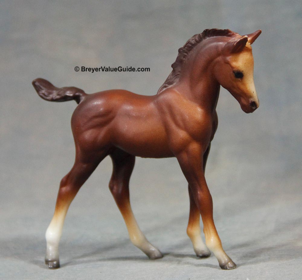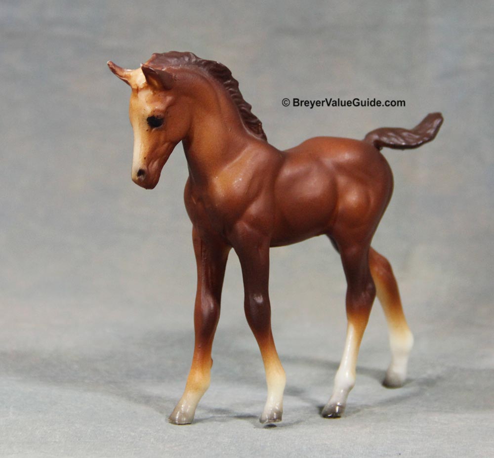 Matte chestnut; bald face; 4 stockings; grey hooves, sold in blister packs