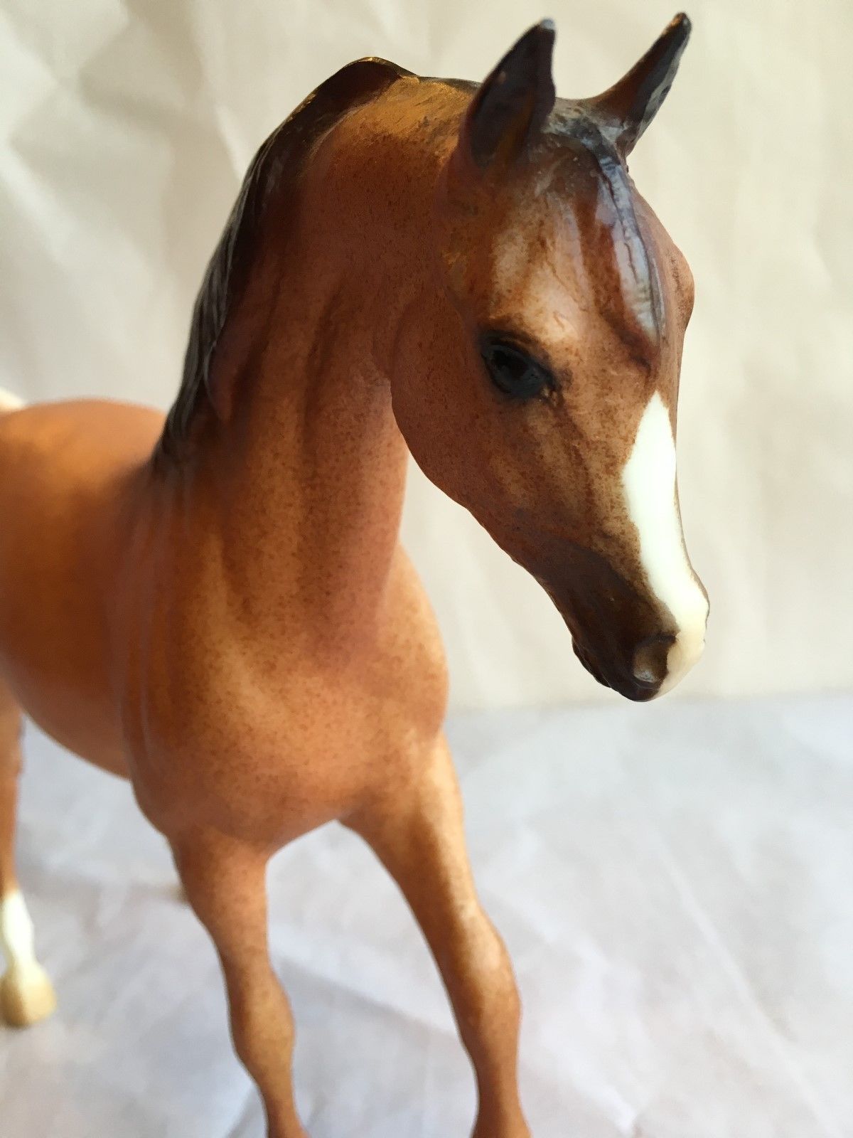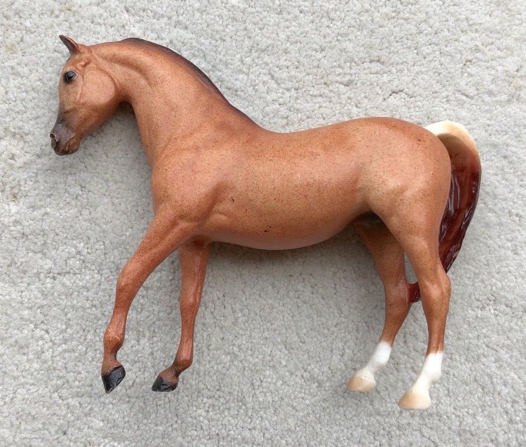 Matte red roan; stripe; white base of tail; 2 hind socks –