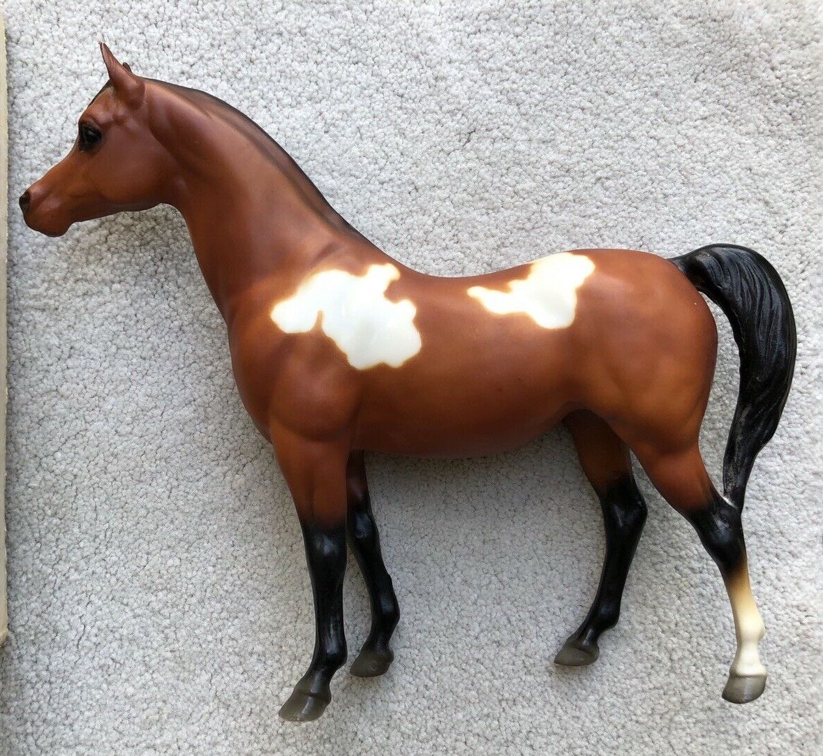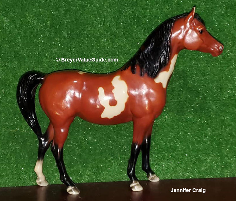 Matte red bay pinto; solid face; 1 hind sock; Sears SR – with Proud Arabian Foal
