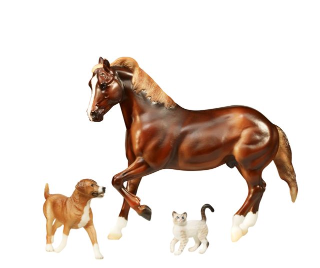 Matte shaded chestnut; flaxen mane and tail; blaze; 3 socks; includes dog and cat companion animals