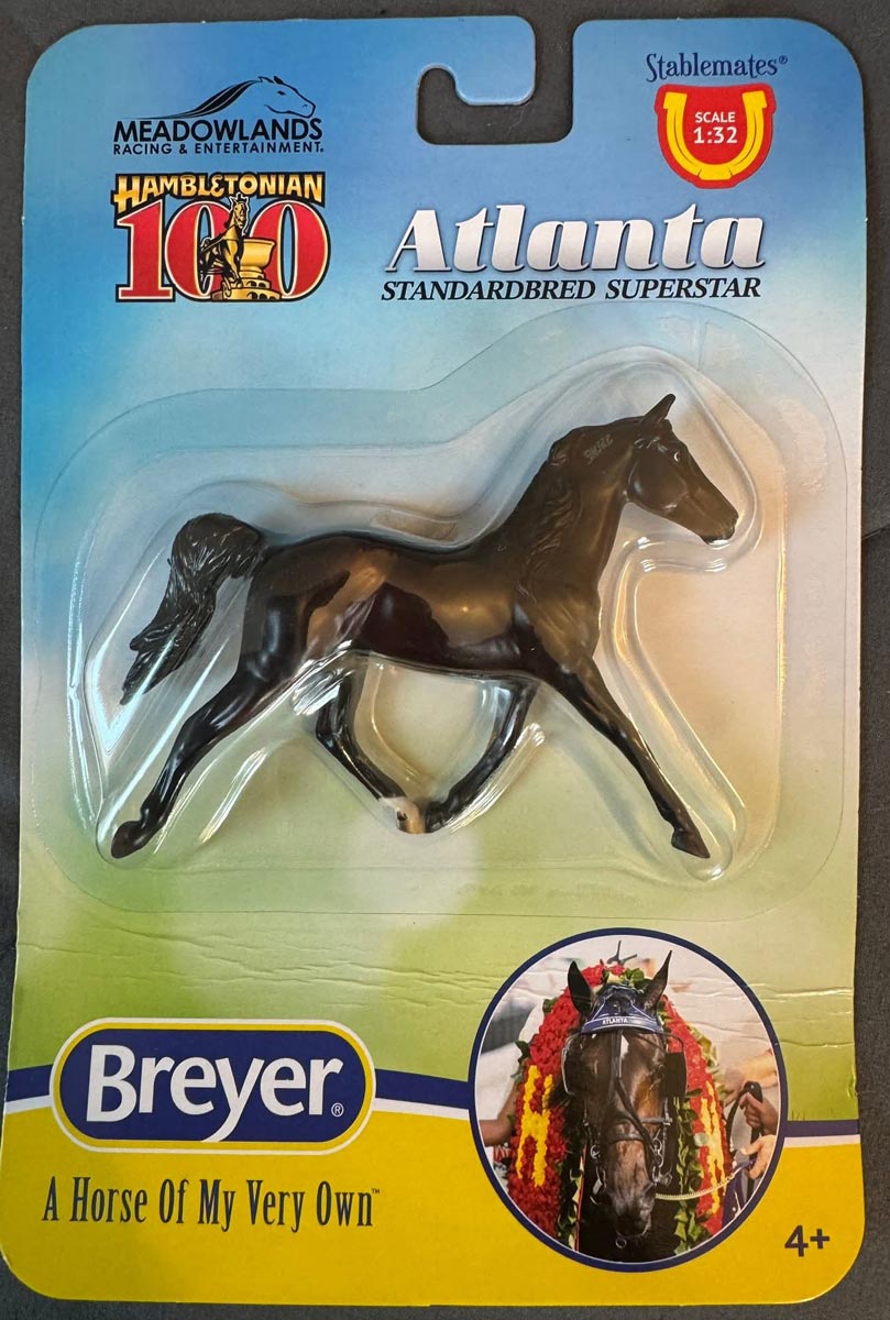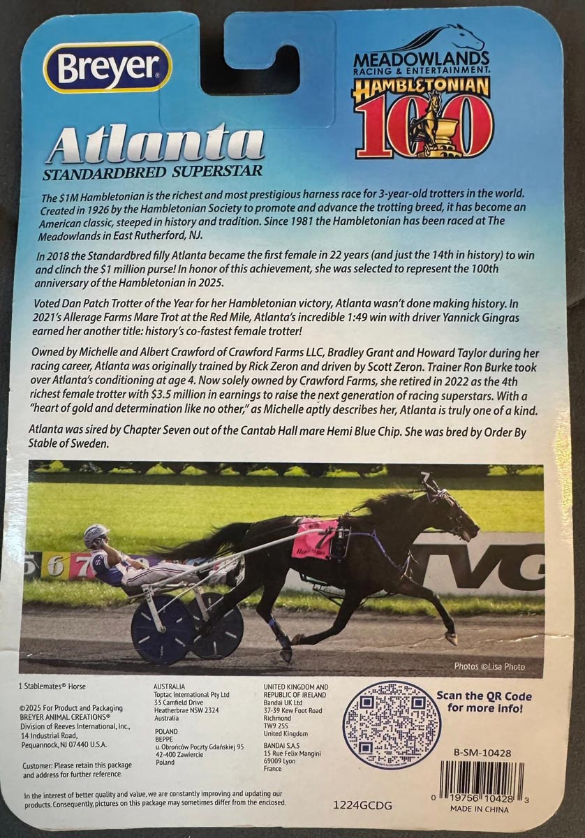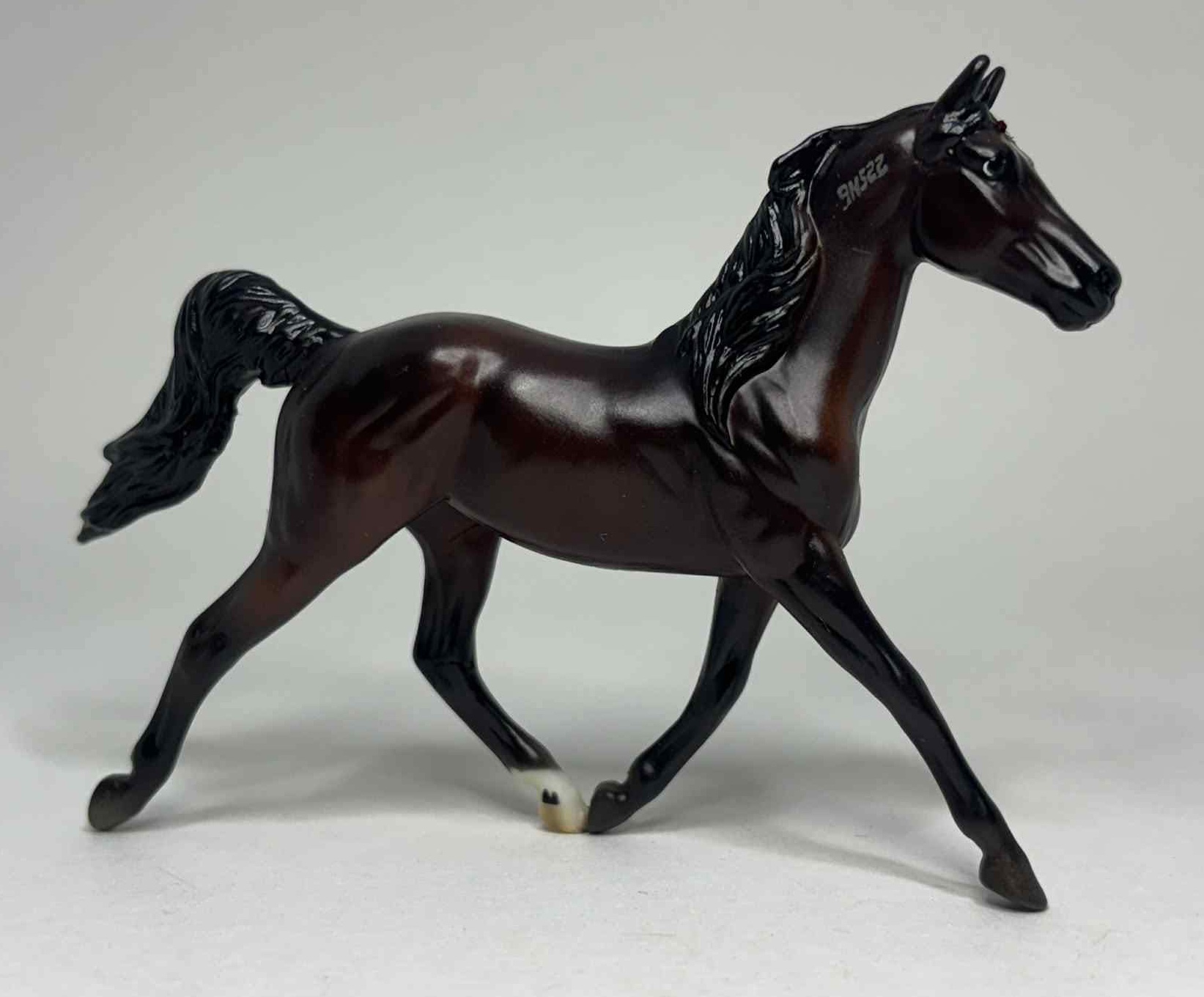 Matte dark bay, blaze, 1 hind sock with hoof stripe, neck brand, 100th Anniversary Hambletonian SR, 1/5000