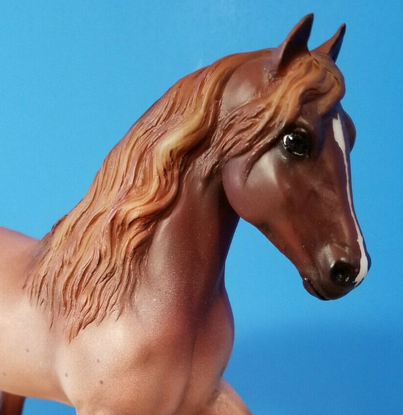 Matte red roan; dark shaded points; flea-bites; star-stripe-snip; flaxen mane and tail; 2 low hind socks; Passage to the Pacific SR; 1/24