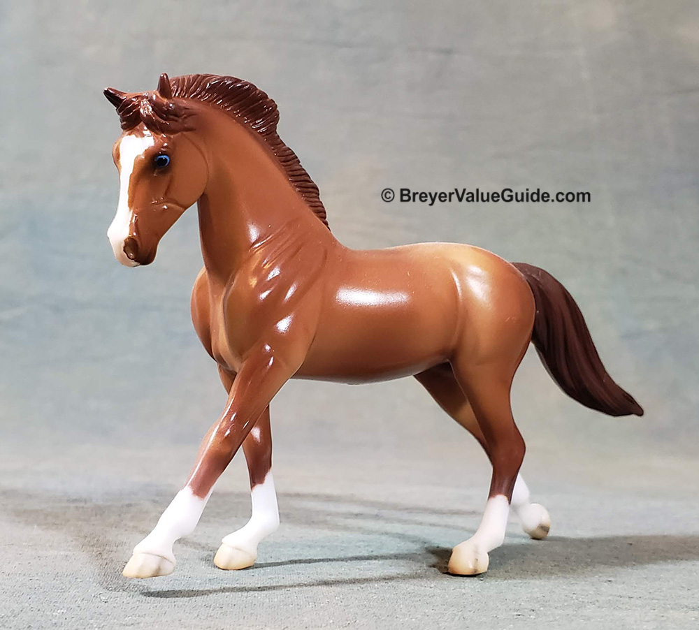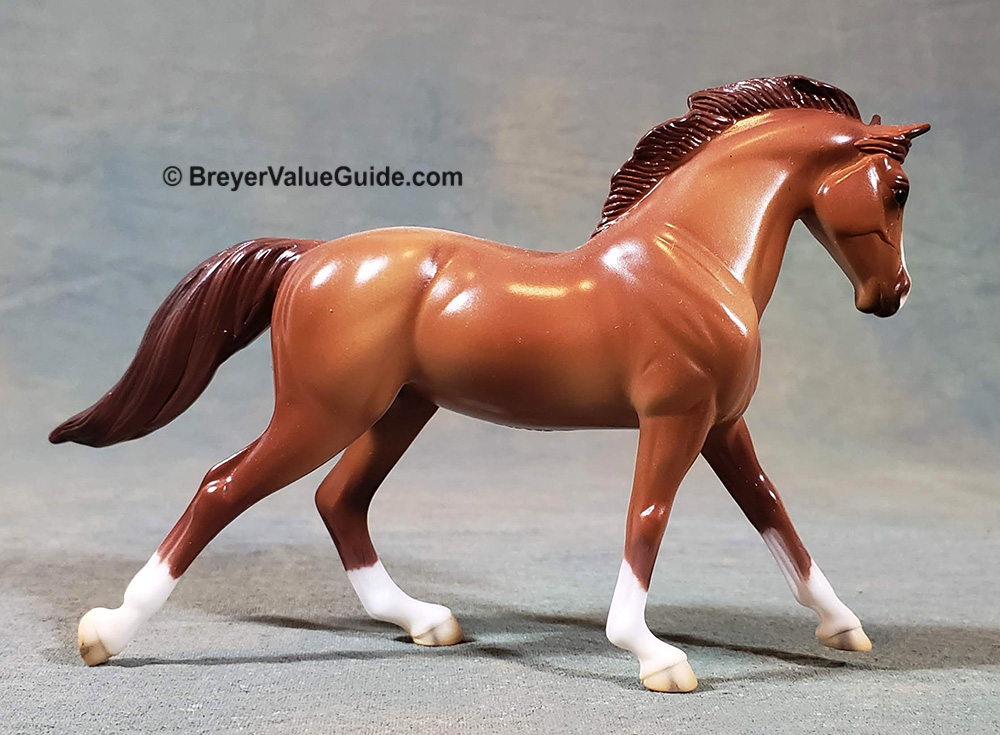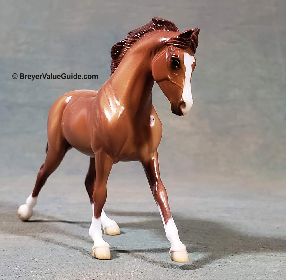 Matte shaded chestnut; blaze; 1 blue eye; 4 socks; striped hooves; Elvis Collection
