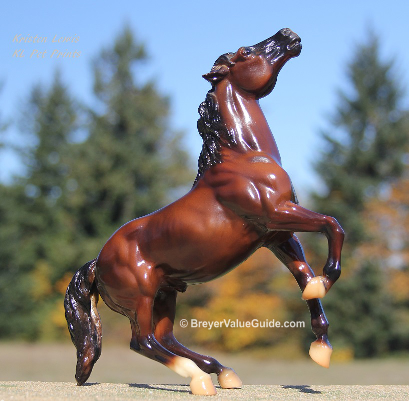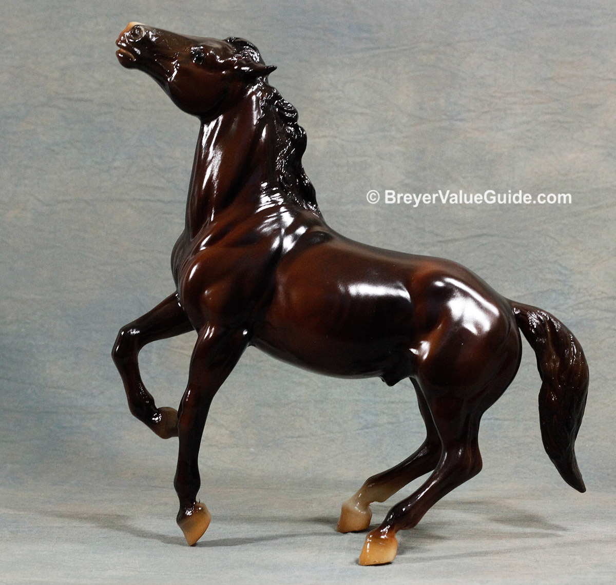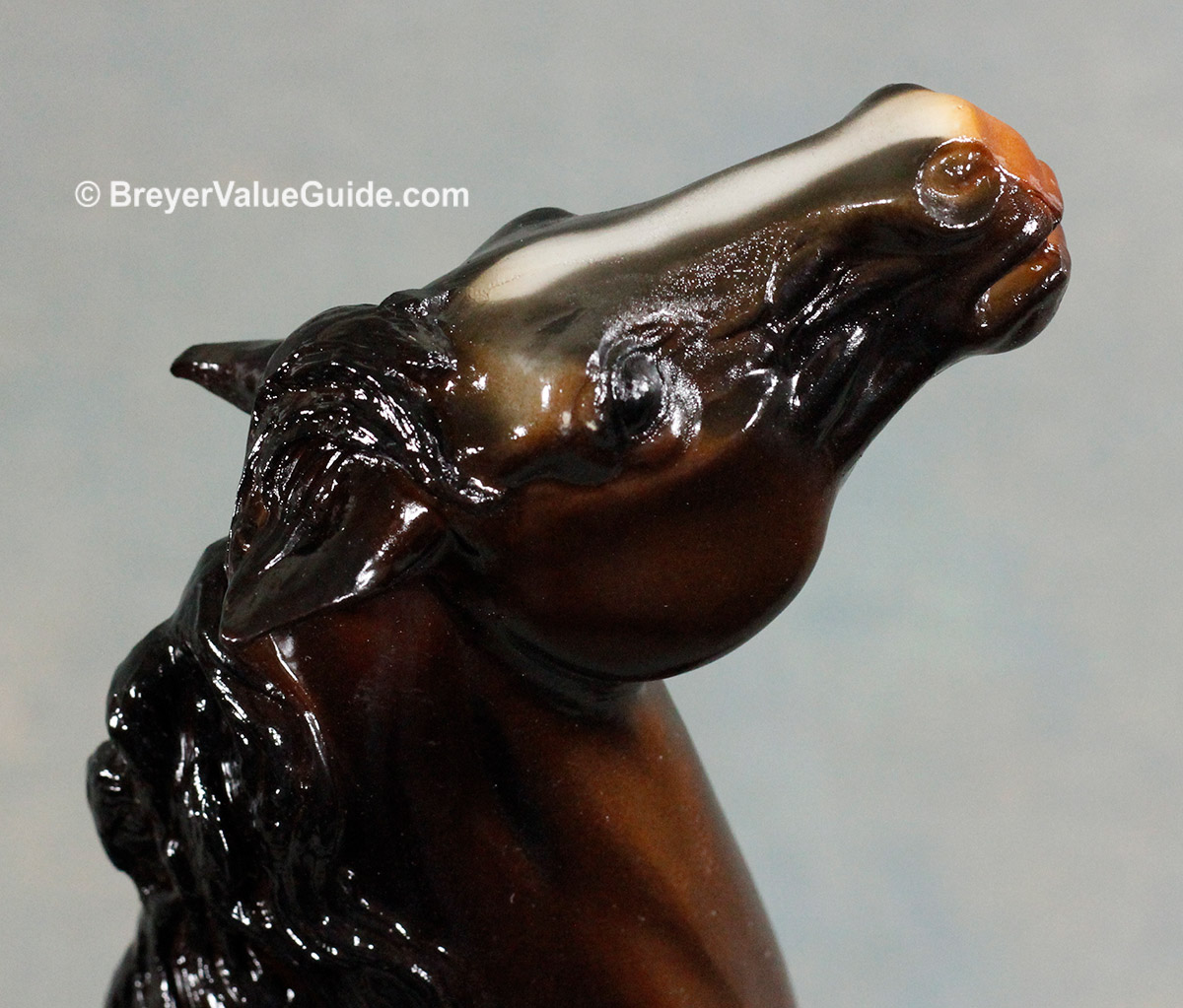Glossy liver chestnut, strip over muzzle, 1 sock, natural hooves