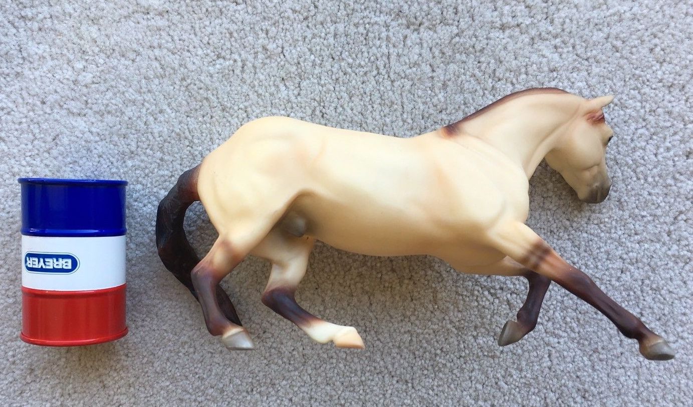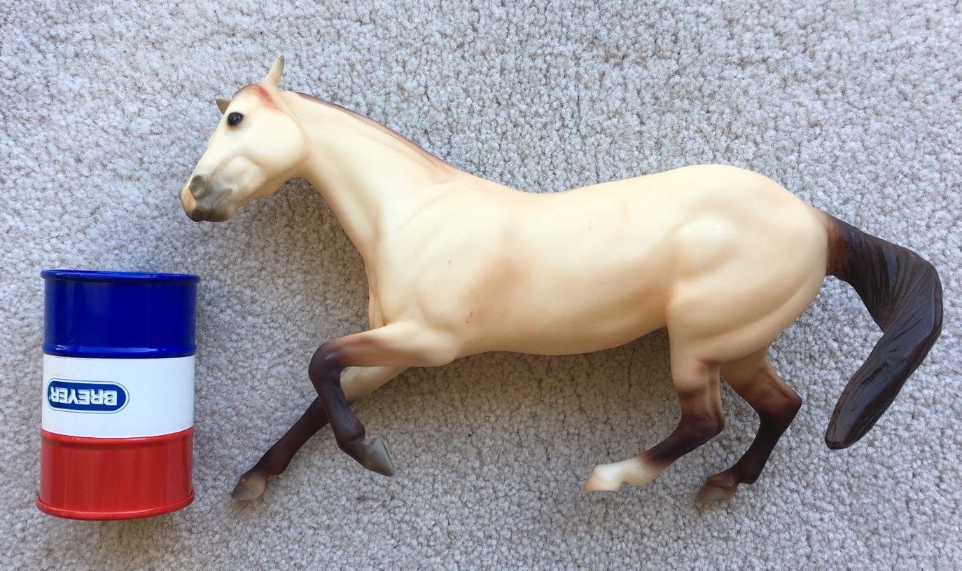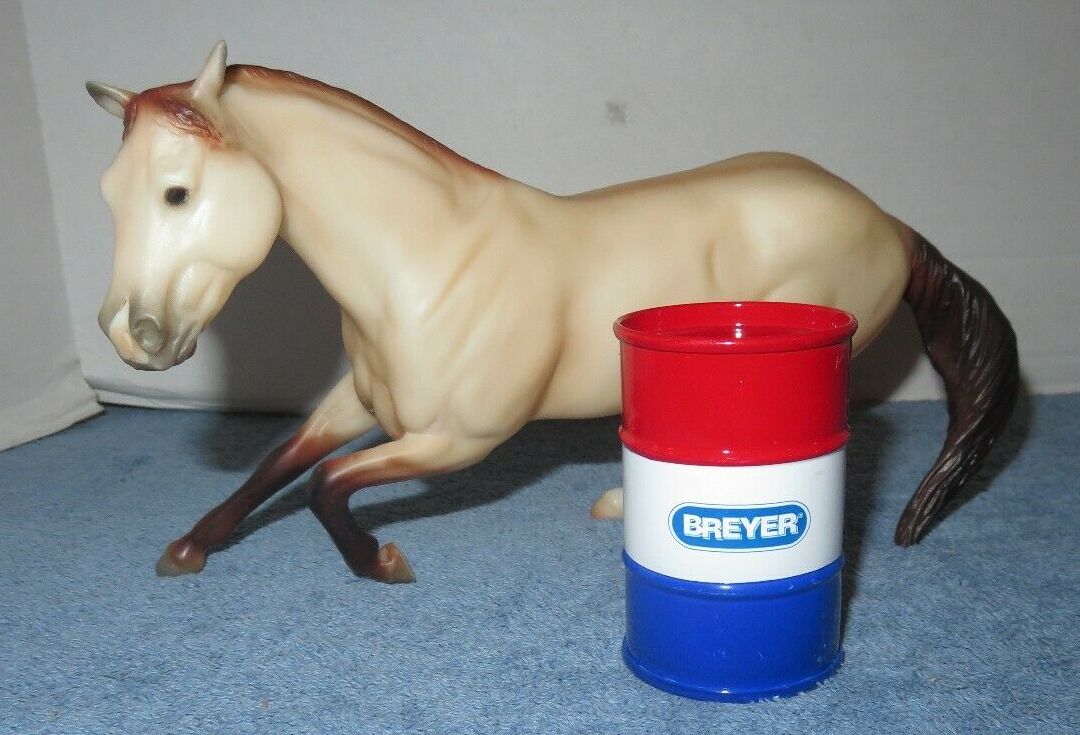 Matte dun, large snip, leg barring and dorsal stripe (may be faint), 1 hind sock, red-white-blue barrel