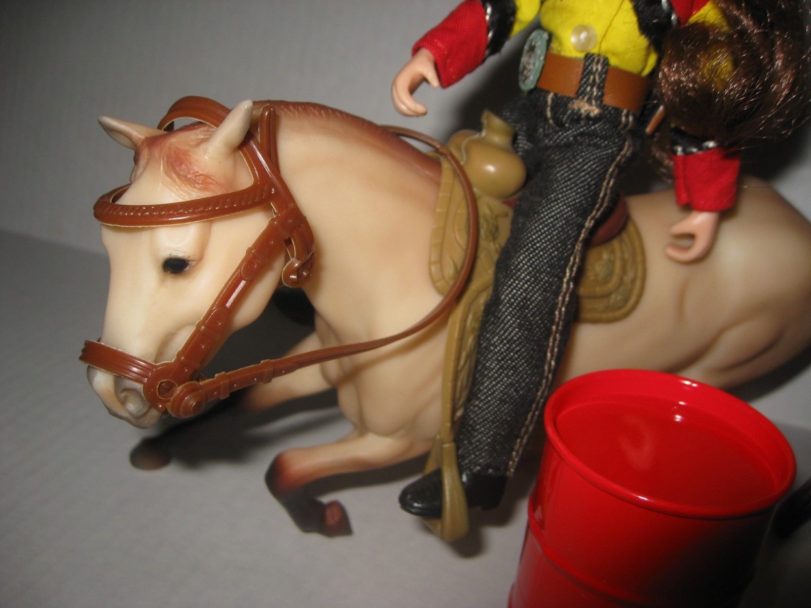 Matte light dun; chocolate points; dorsal stripe; 1 hind sock; with western rider; tack and barrel; also released as #6003 without the rider and tack
