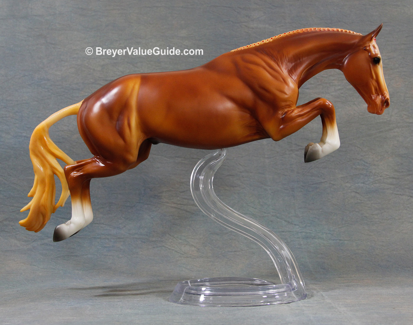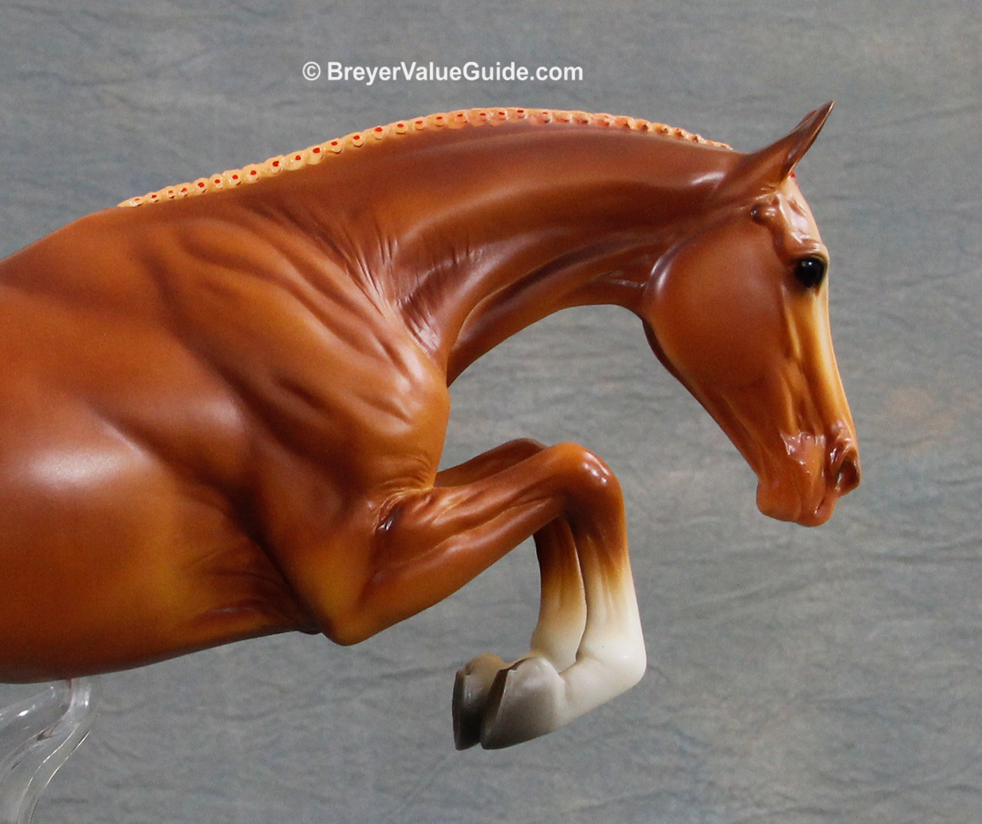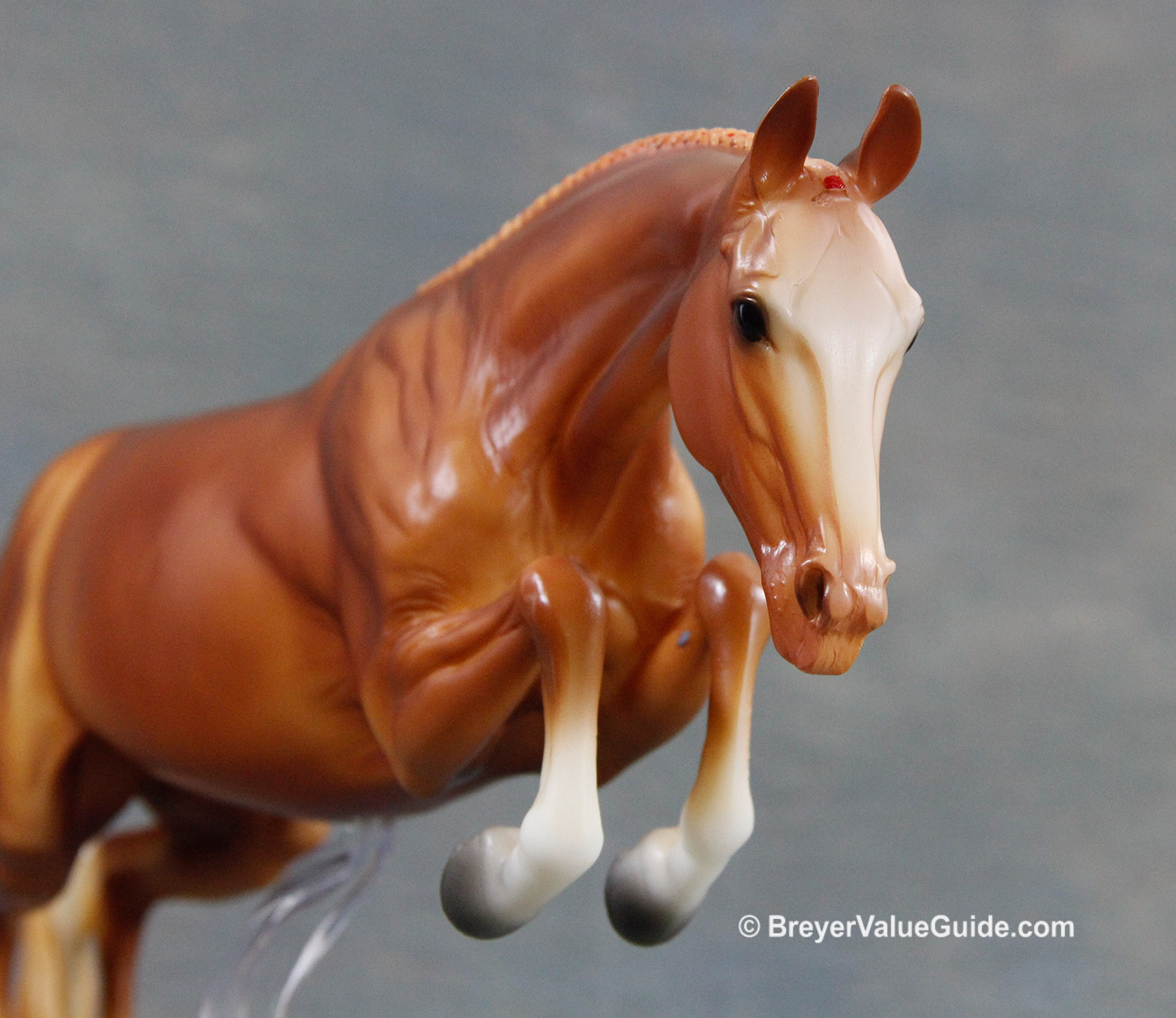 Matte chestnut; flaxen mane and tail; bald face; 4 stockings; red ribbons; Vintage Club SR; 1/500