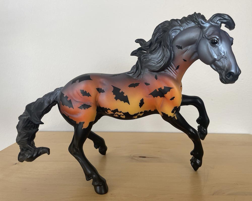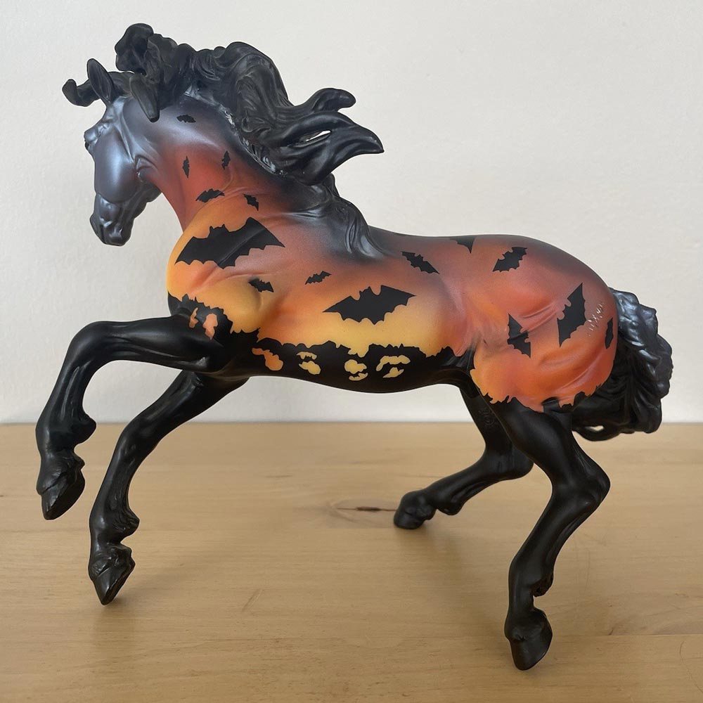 Matte black with purple and orange sunset decorator colors with black bat pattern, Halloween SR